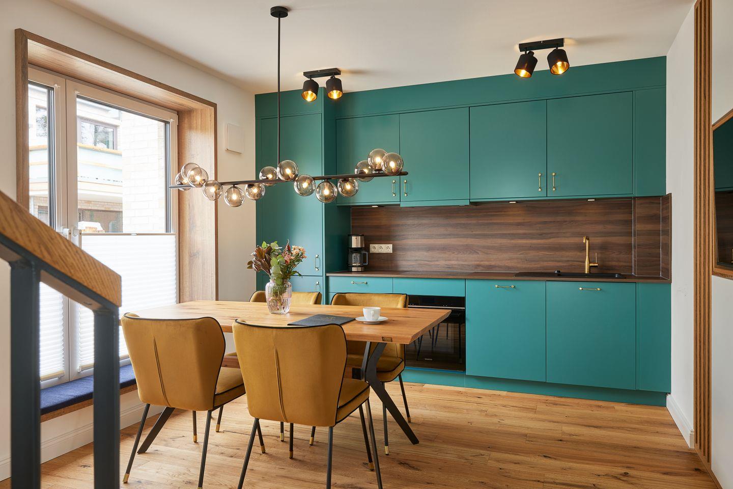 Der ca. 125 m² große Hausteil bietet alles, was Sie sich für eine erholsame Nordsee-Auszeit wünschen: im Erdgeschoss lädt der moderne Wohn- und Essbereich mit offener Küche und Design-Polstermöbeln zum entspannten Zusammensein ein. Die stilvolle Küche mit türkisenen Fronten und goldenen Armaturen ist nicht nur optisch ein Hingucker, sondern auch umfassend ausgestattet. An den Wohnbereich schließt Sie Ihre große Sonnenterrasse mit Blick in die Sandlandschaft an. Zudem finden Sie im Erdgeschoss ein Gäste-WC.