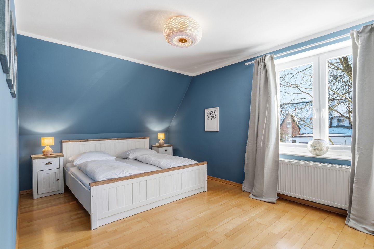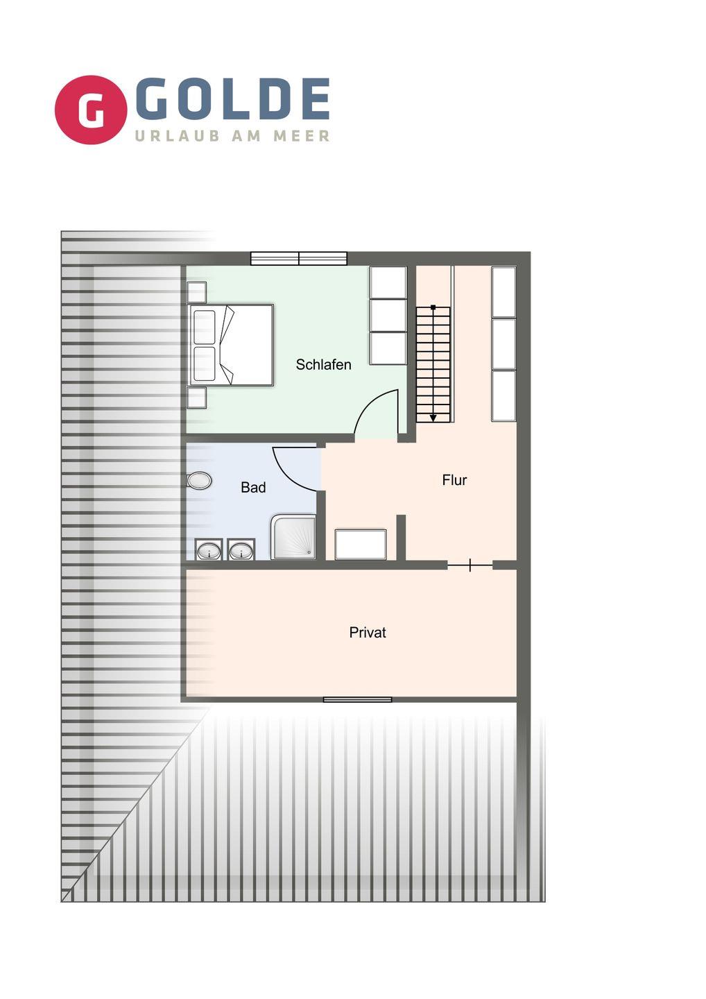 Über eine Holztreppe gelangen Sie in das Obergeschoss. Ein Schlafzimmer mit einem Doppelbett (1,80 x 2,00) ist ausgestattet mit einem großen Kleiderschrank. Darüber hinaus befindet sich im Obergeschoss ein weiteres Bad mit Dusche.