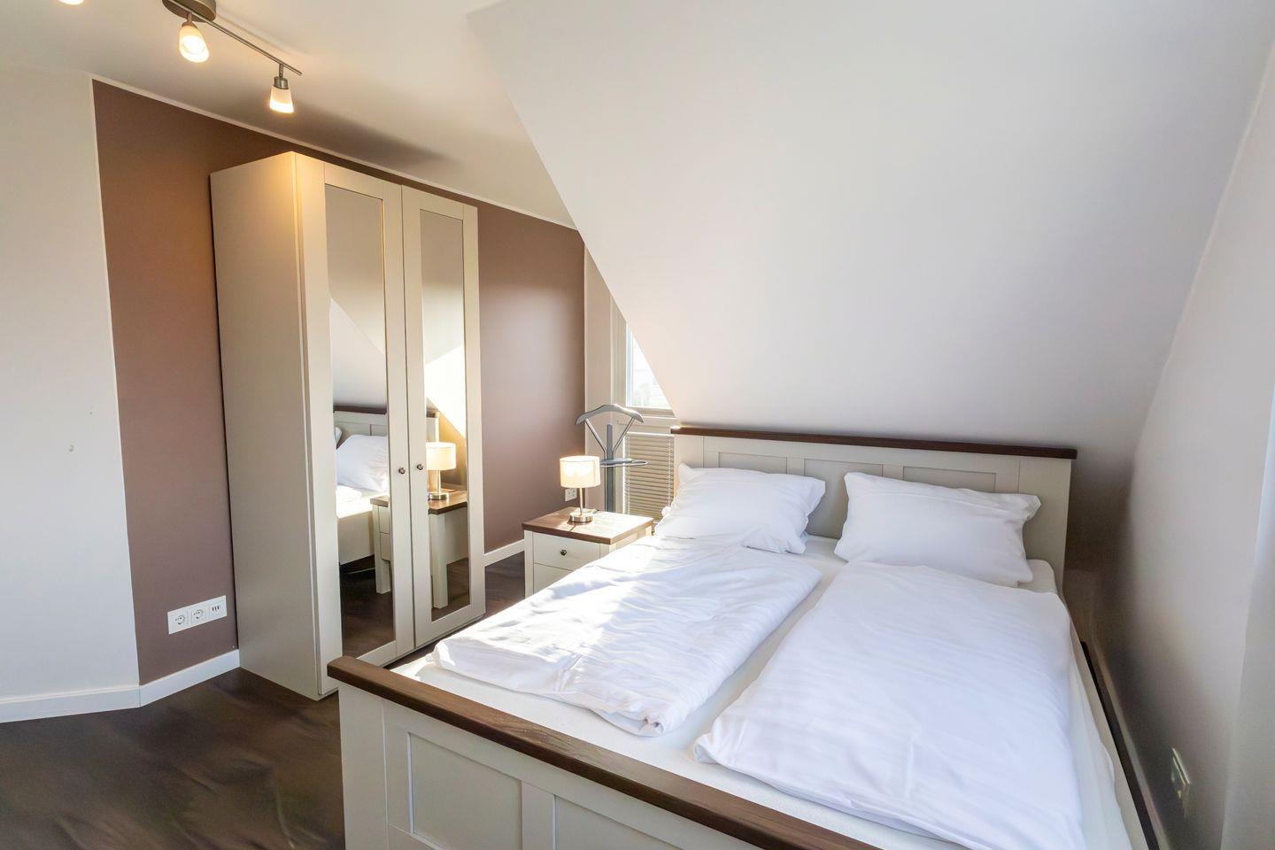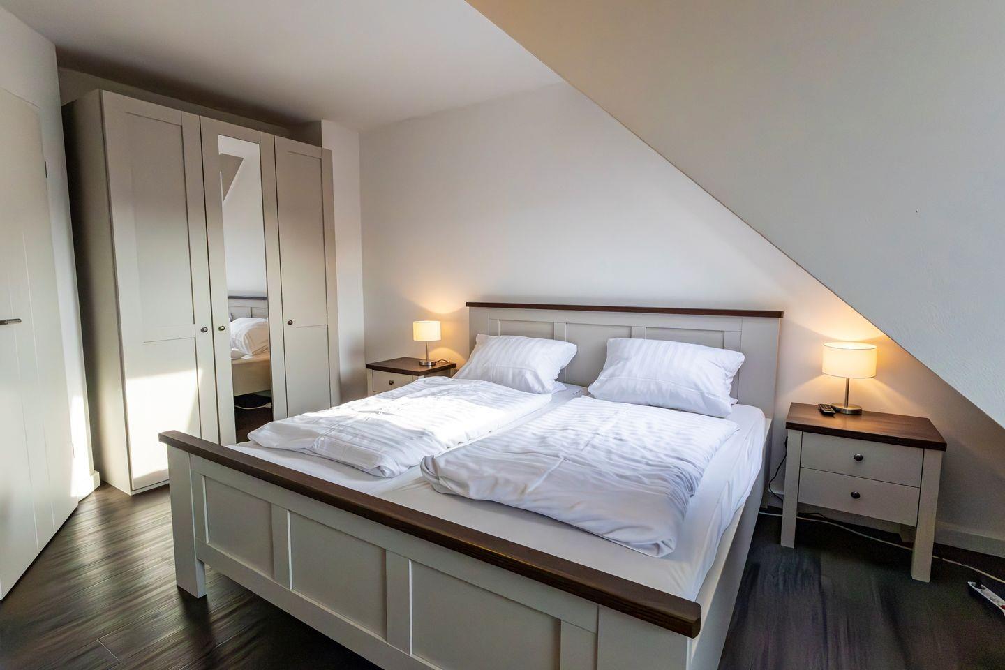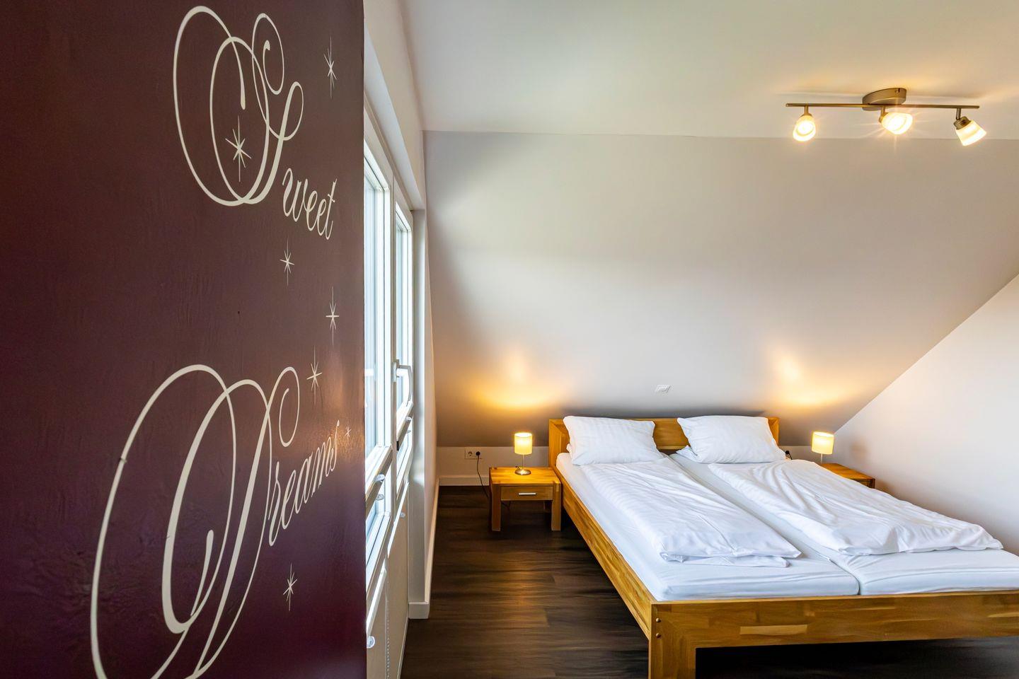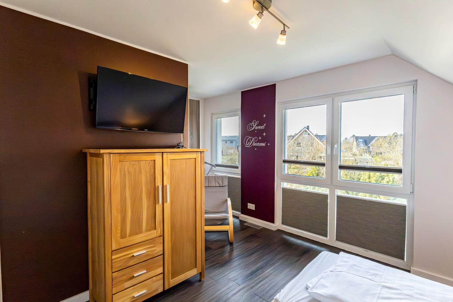 Dachgeschoss: ein Schlafzimmer mit Doppelbett (180x200cm- Einzelmatratzen) und TV