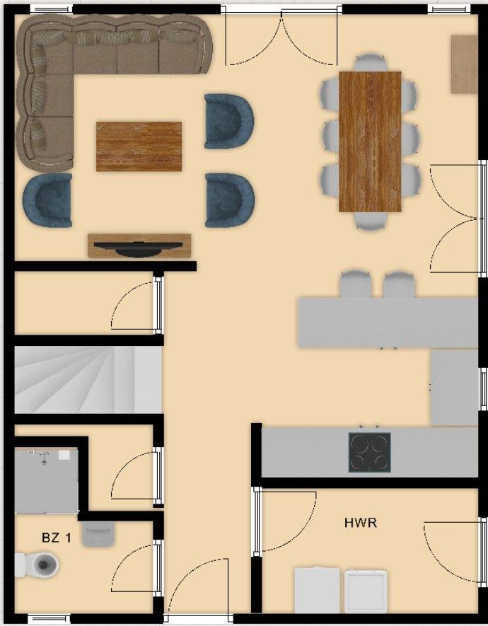 Erdgeschoss: Eingangsbereich, Duschbad/WC, großzügiger Wohnraum mit offener ,voll ausgestatteter Küche