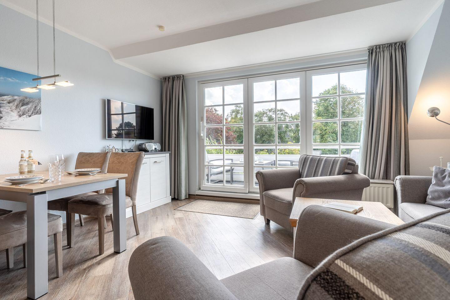 Ein weiteres Highlight ist der private Balkon mit Gartenblick und Gartenmöbeln – ein idealer Ort zum Verweilen nach einem Tag am Strand oder bei Spaziergängen in der Umgebung. Bücher und Spiele stehen für gemütliche Stunden bereit. Ein Safe sorgt für die sichere Aufbewahrung Ihrer Wertsachen.