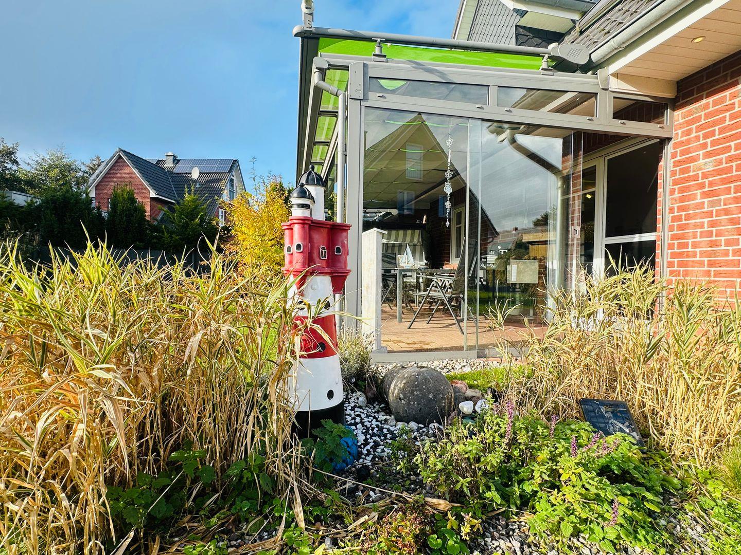 Ein besonderes Highlight ist der lichtdurchflutete Wintergarten mit Südwest-Ausrichtung. Hier genießen Sie auf dem großzügigen Sitzbereich oder im Strandkorb die Sonne – perfekt, um den Tag bei einer Tasse Kaffee oder einem Glas Wein ausklingen zu lassen.