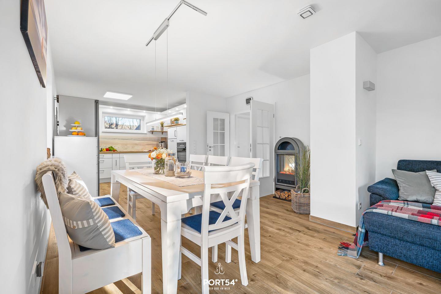 Im offenen Wohn- und Essbereich findest du eine komfortable Sofaecke, einen separaten Essplatz und zahlreiche Fenster, die viel Tageslicht hereinlassen und den Blick ins Grüne ermöglichen. Der elektrische Kamin verleiht dem Raum noch mehr Gemütlichkeit. Vier digitale Fernseher stehen dir ebenso zur Verfügung wie eine schnelle Internetverbindung, sodass auch das Arbeiten aus dem Ferienhaus problemlos möglich ist. Zur Entspannung im Freien laden die sonnige Terrasse mit Gartenblick, Sonnenliegen, zwei Strandkörbe sowie eine Liegewiese ein – ideale Voraussetzungen, um die maritime Atmosphäre in aller Ruhe zu genießen. Grillfreunde können den eigenen Gasgrill und das Gartenhaus nutzen, während die Gartenmöbel zu geselligen Mahlzeiten im Freien einladen.