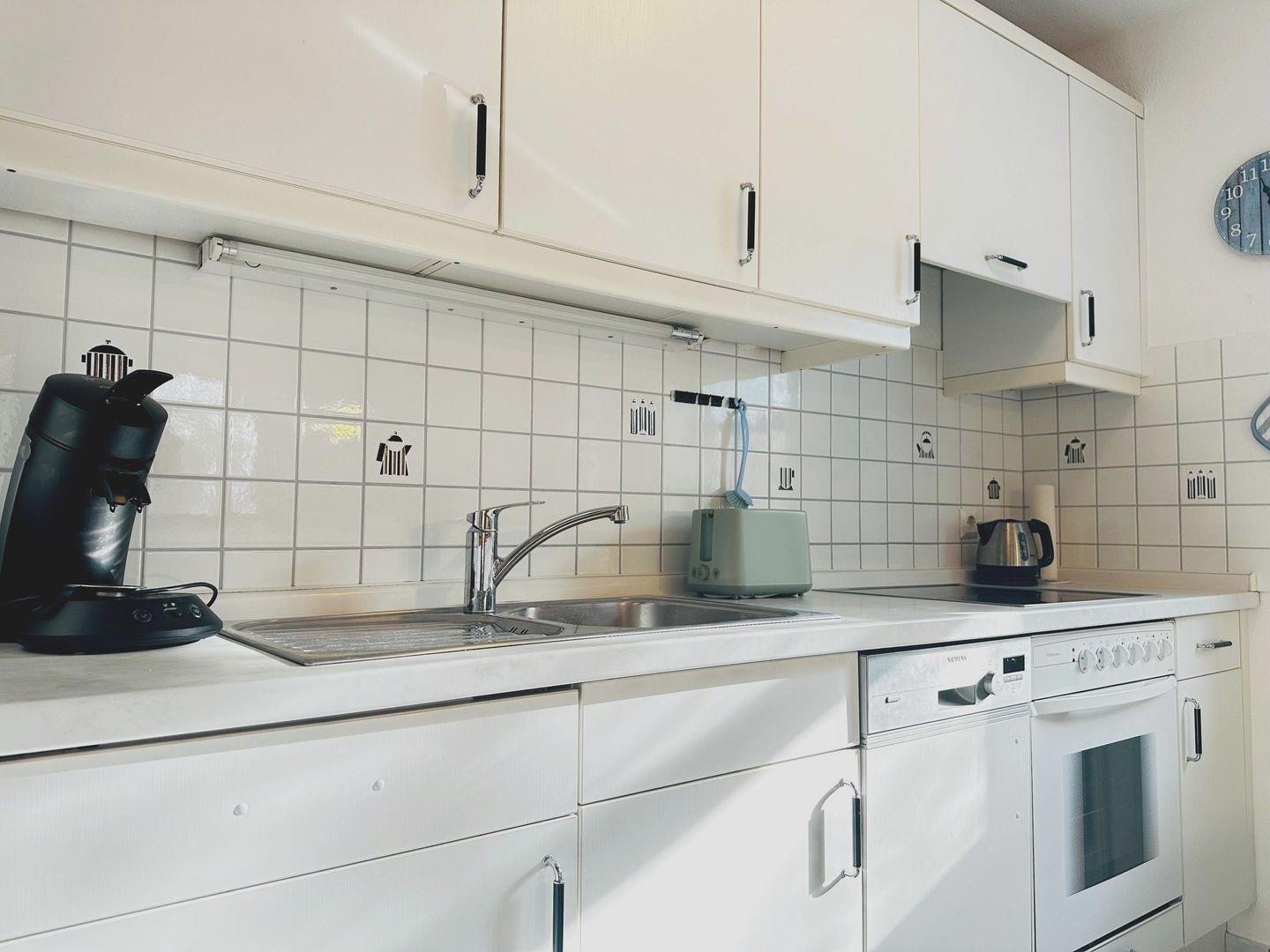 Die geschlossene Küche grenzt an den Wohnbereich an und ist mit 4-Platten-Cerankochfeld, Backofen, Geschirrspülmaschine, Senseo-Kaffeemaschine, Filterkaffeemaschine, Toaster und Wasserkocher ausgestattet.