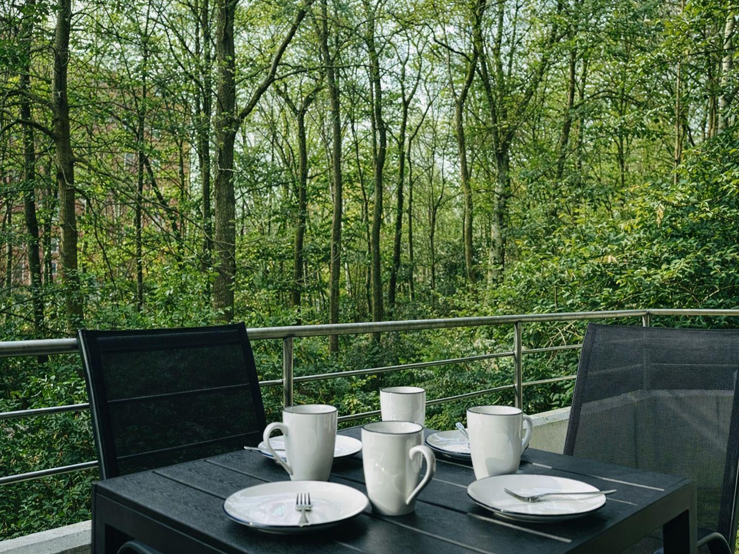 Wohnzimmer mit Ecksofa, Essbereich und TV sowie Zugang zum großzügigen, möblierten Balkon mit Südwest-Ausrichtung und Blick in den Kurwald. Die angrenzende, geschlossene Küche ist mit Cerankochfeld, Backofen, Geschirrspülmaschine sowie Senseo- und Filterkaffeemaschine ausgestattet.