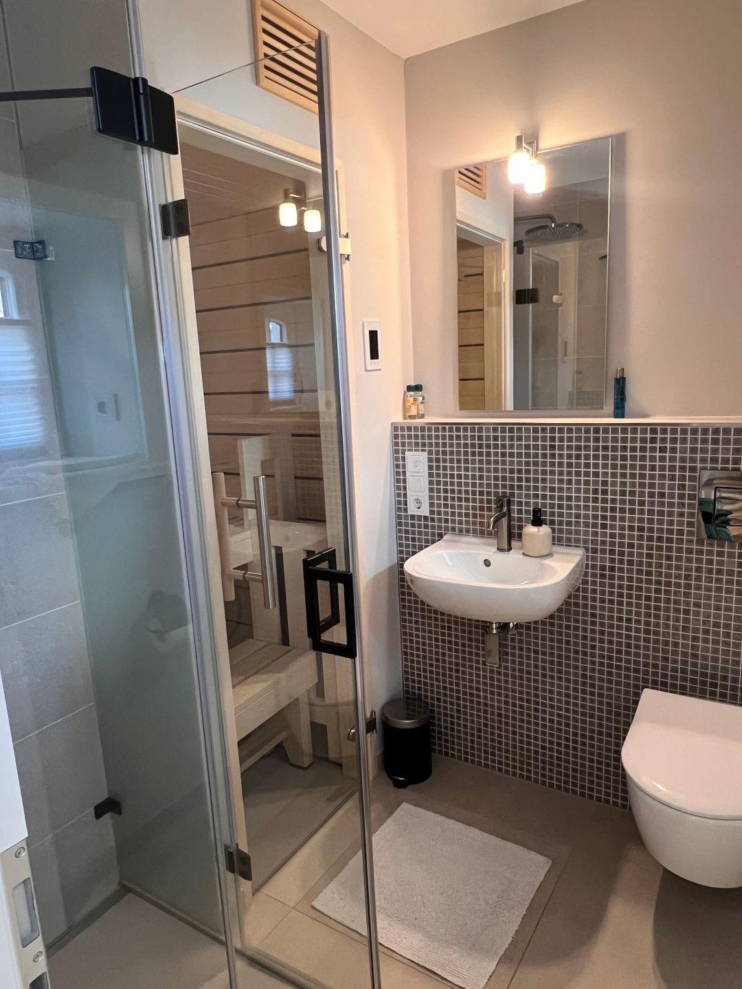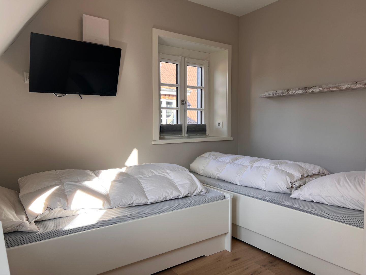 Über eine Holztreppe gelangt man in das Obergeschoss mit einem weiteren Duschbad und zwei Schlafzimmern. Eines mit einem Doppelbett und eines mit zwei Einzelbetten.