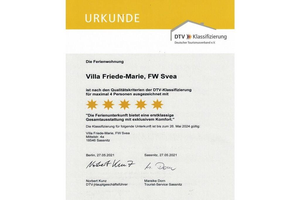 Villa Friede-Marie ligger i en fremtrædende, central og rolig beliggenhed oven for Sassnitz' havn. Restauranter, butikker og en swimmingpool ligger i umiddelbar nærhed. Den historiske gamle bydel, byhavnen, kridtklinterne og Sassnitz' unikke stenstrand ligger kun få minutters gang væk. Villa Friede-Marie tilbyder flere ferielejligheder. Der er elevator til rådighed. Sassnitz er et statsanerkendt kursted og er derfor underlagt en turistskat.