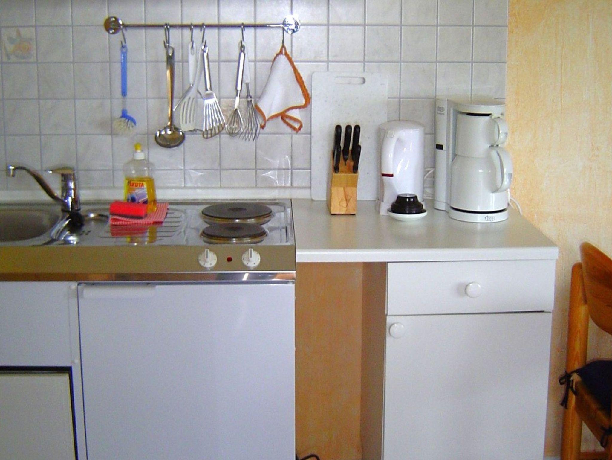 • Die kleine Küchenzeile ist offen zum Wohnraum und bietet ein 2-Platten-Herd, Kühlschrank, Kaffeemaschine eine Geschirrspülmaschine