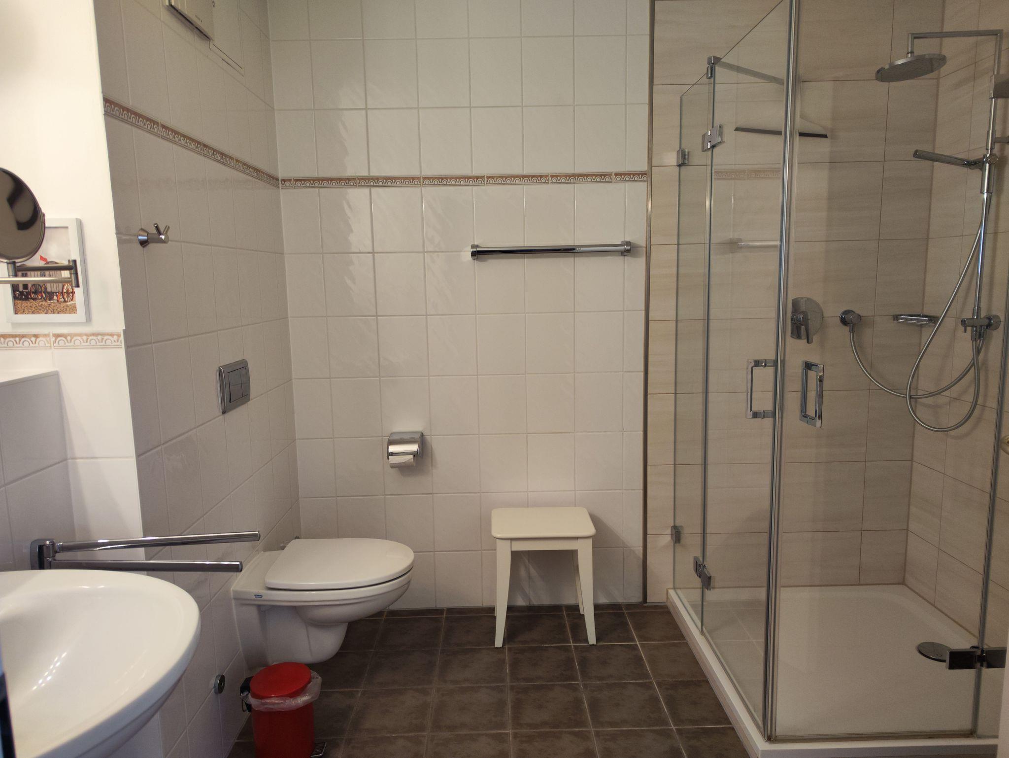 ? Das Bad ist mit Dusche, WC und Fön ausgestattet. Pro Person liegen ein großes und ein kleines Handtuch bereit.
