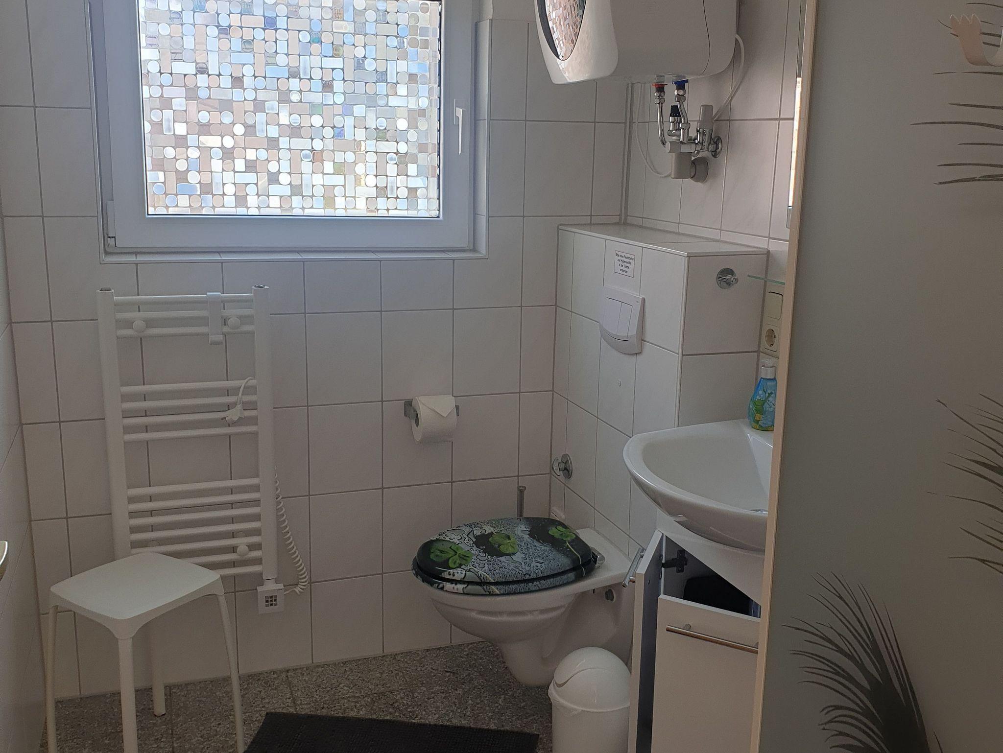 Das moderne Badezimmer verfügt über Dusche, WC und Fön.
