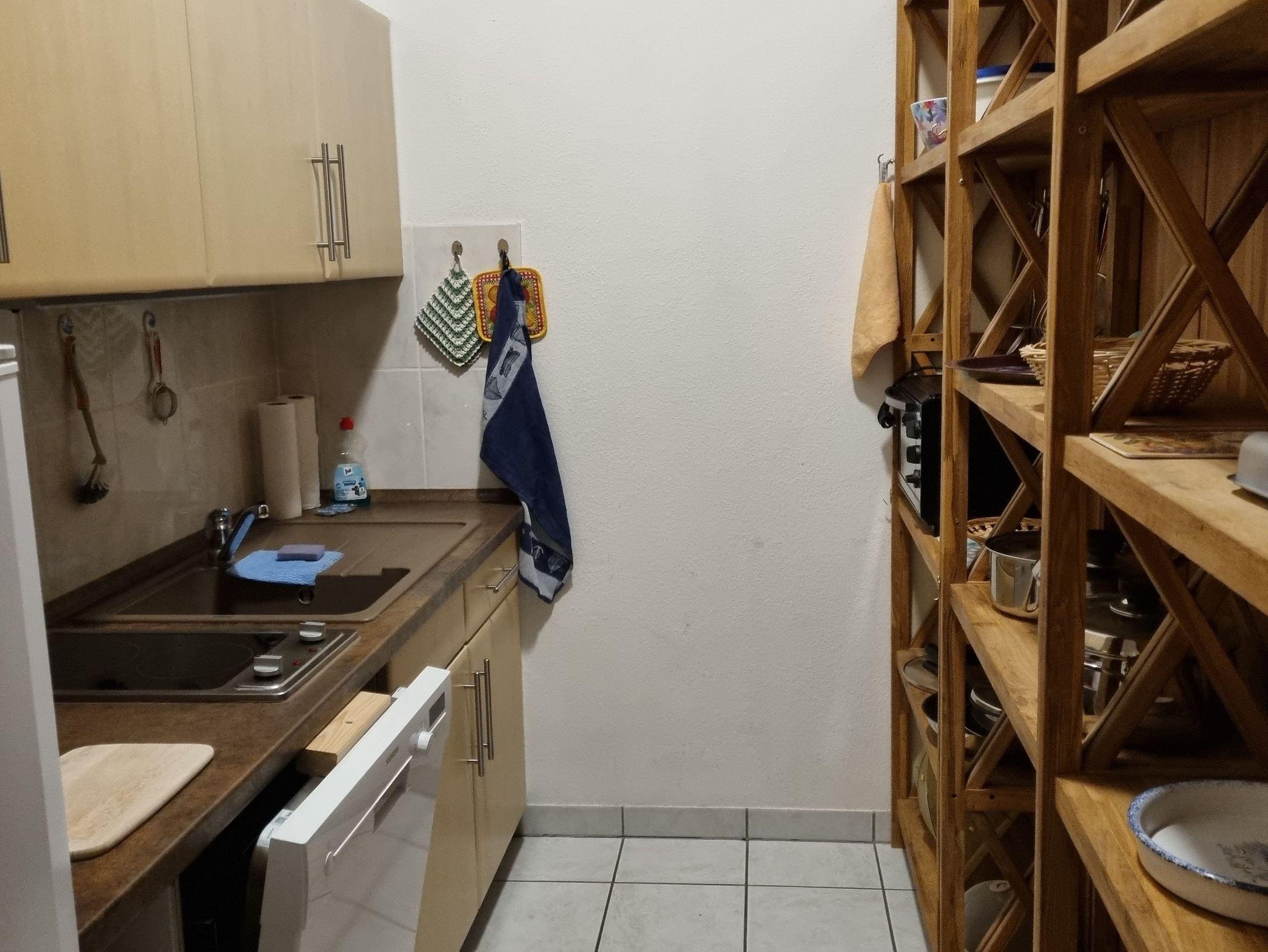 ? Küchenzeile mit 2 Platten-Ceranfeld, Spüle und Geschirrspüler, Kühl-Gefrierkombination, Oberschränke mit Backformen, Geschirr, Kaffee- und Teebereiter etc.