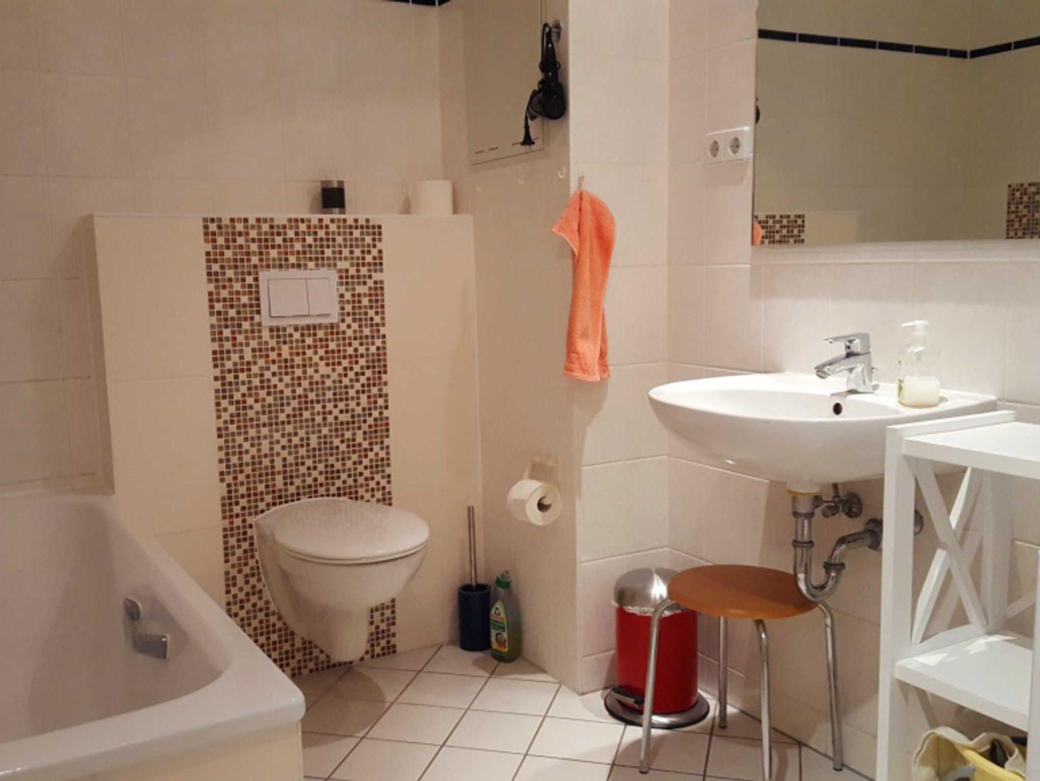 ? Badezimmer mit Badewanne, WC und Handwaschbecken, Spiegel, Haartrockner, Regal, Hocker und Waschmaschine