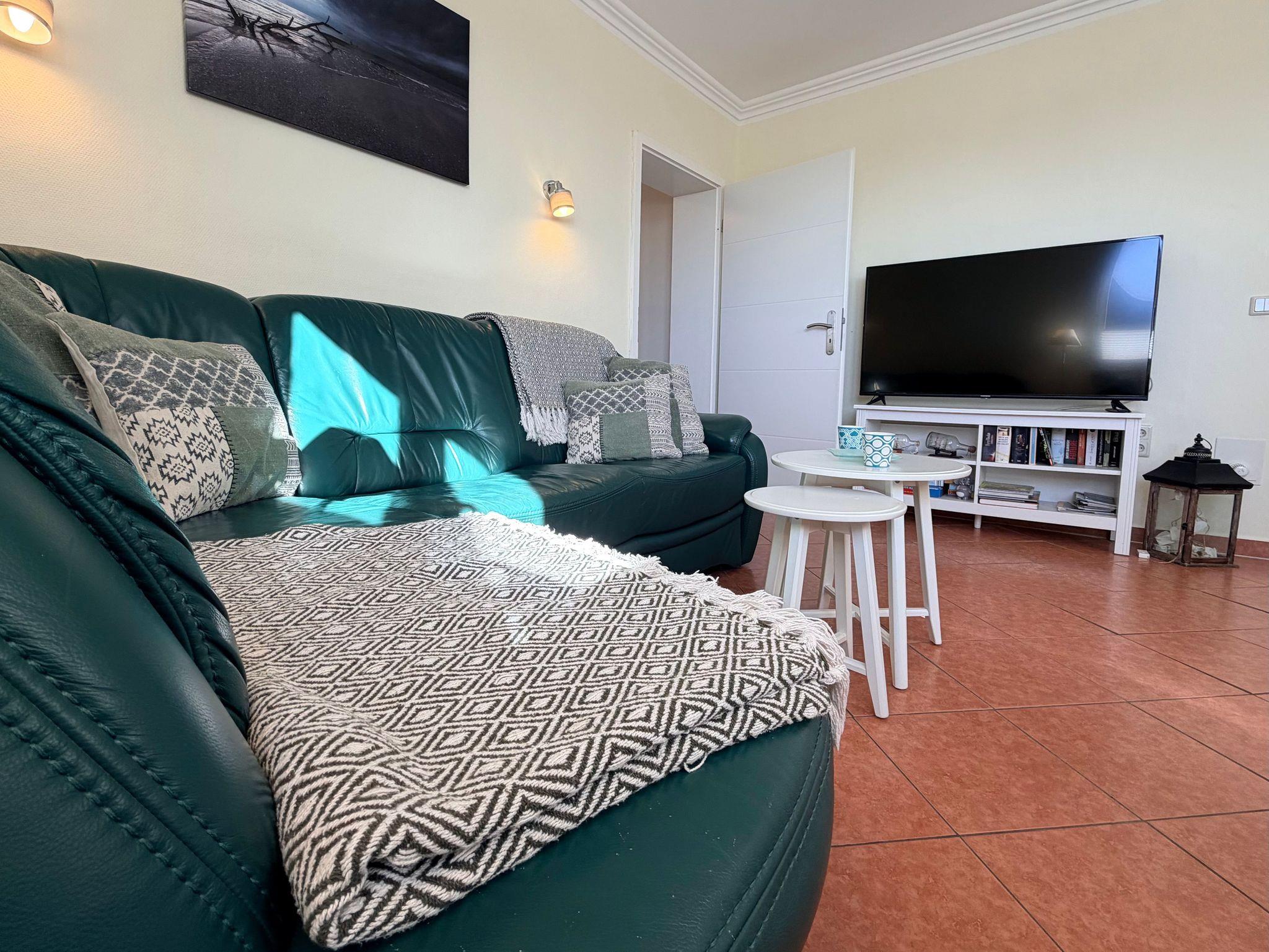 ein geräumiges Wohnzimmer mit Eckcouch (Schlaffunktion), Flachbild-TV, zusätzlicher Sitzgruppe für Spieleabende und viel Stauraum. Für zusätzlichen Komfort sorgen eine Fußbodenheizung im Bad und Wohnzimmer sowie Plissees in allen Räumen. Im Schlafzimmer ermöglichen zusätzliche Gardinen eine angenehme Verdunkelung für erholsamen Schlaf.