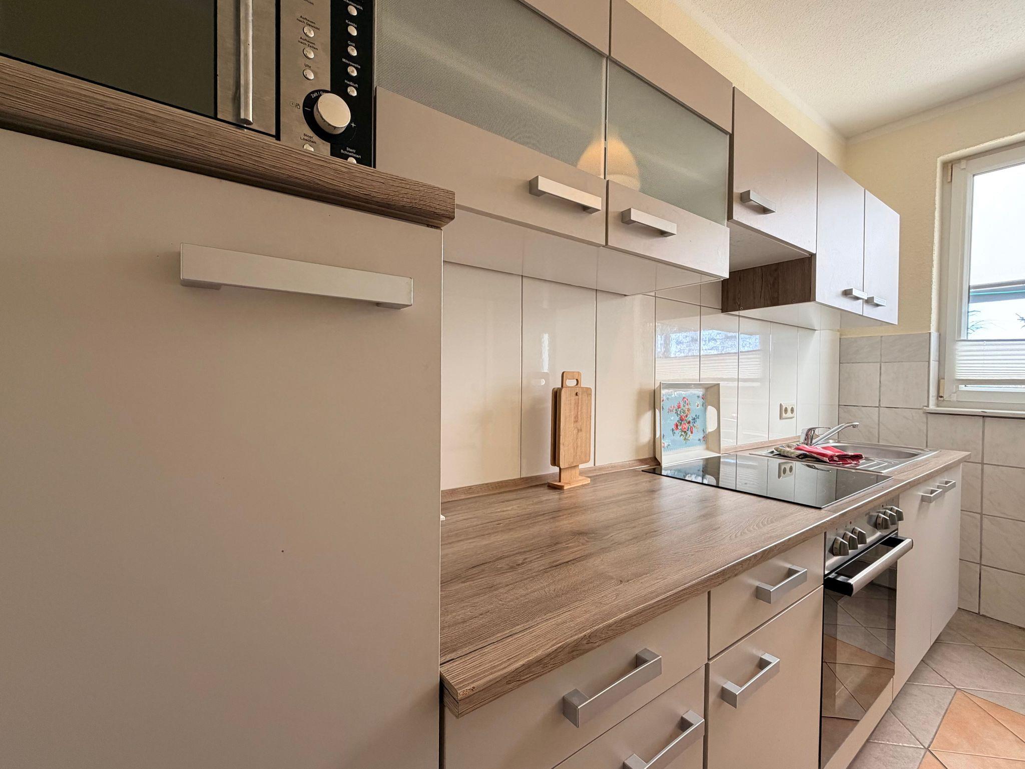 Die Küche lässt keine Wünsche offen: Ceranfeld mit Backofen, Kühlschrank, Mikrowelle, Kaffeemaschine, Toaster, Wasserkocher, Eierkocher sowie umfangreiches Geschirr, Besteck und Pött un Pann hier können Sie sich ganz wie zu Hause fühlen.