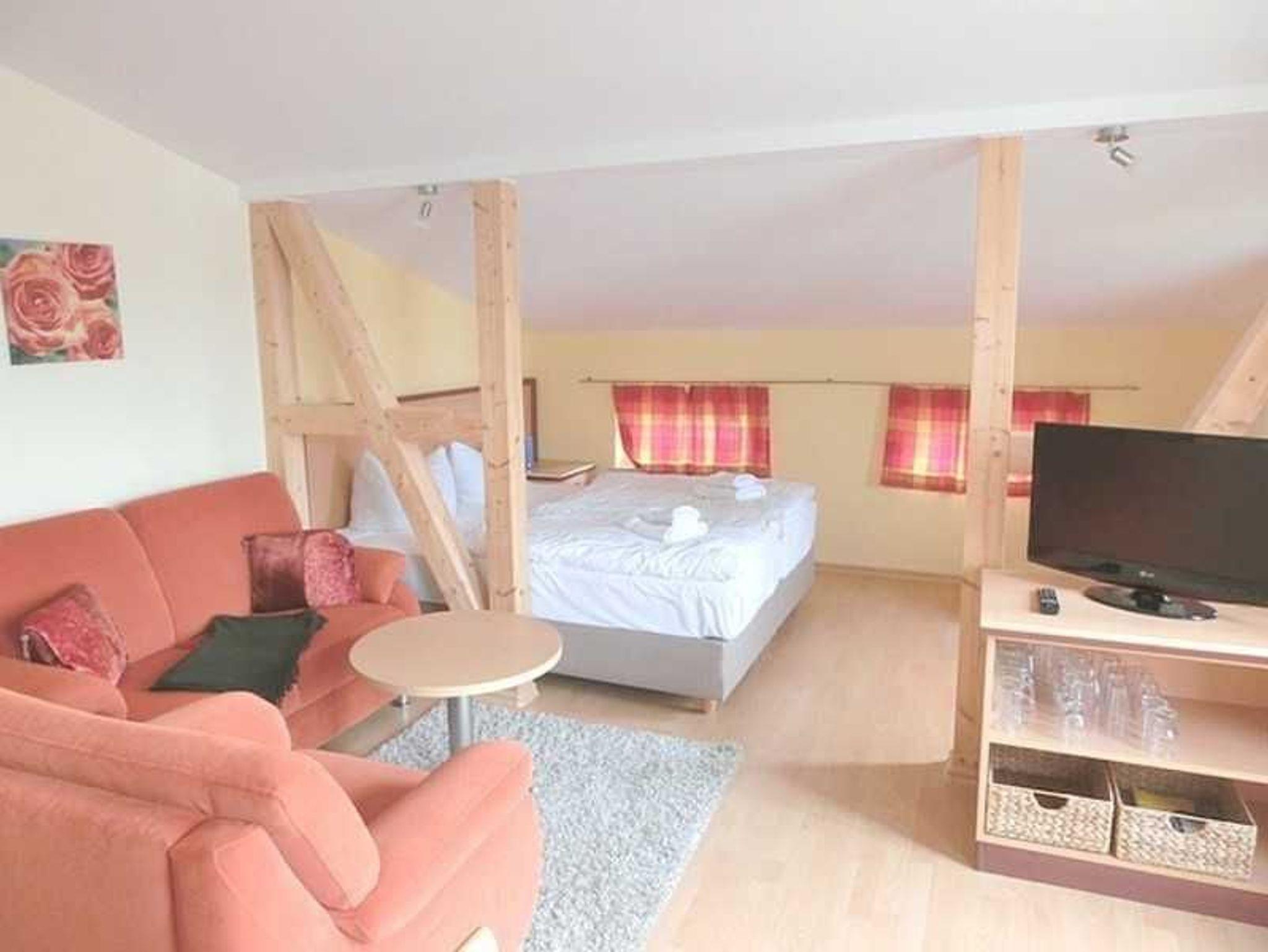 * ein Wohnraum mit Doppelbett, Essecke und TV