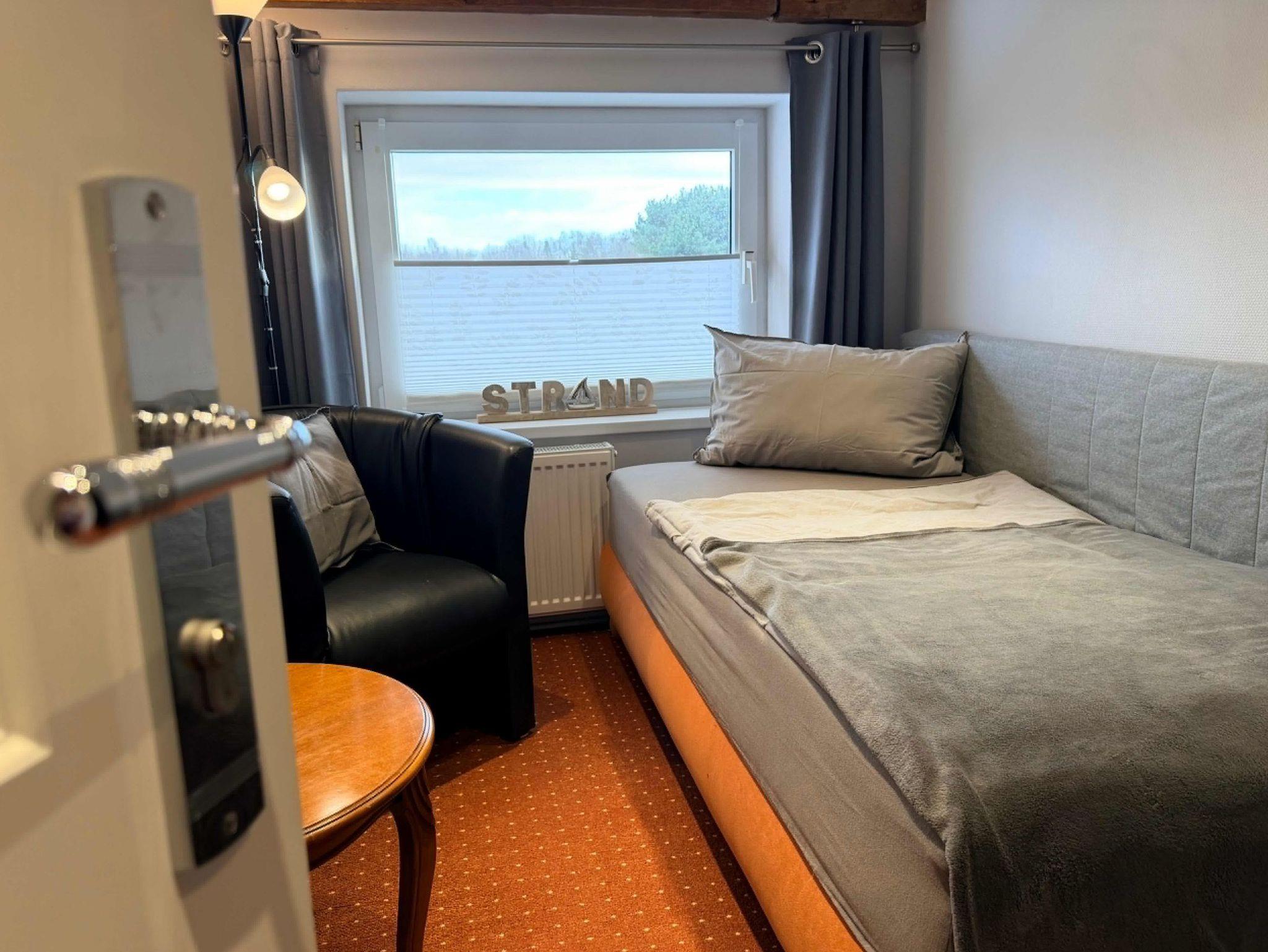 Vier behagliche Schlafzimmer bieten ausreichend Rückzugsmöglichkeiten. Jedes Zimmer verfügt über ein komfortables Boxspringbett, TV, WLAN, Leselampe, Kleiderschrank, kleine Sitzecke und Garderobe. Vorhänge und Plissees sorgen für angenehmen Lichtschutz.