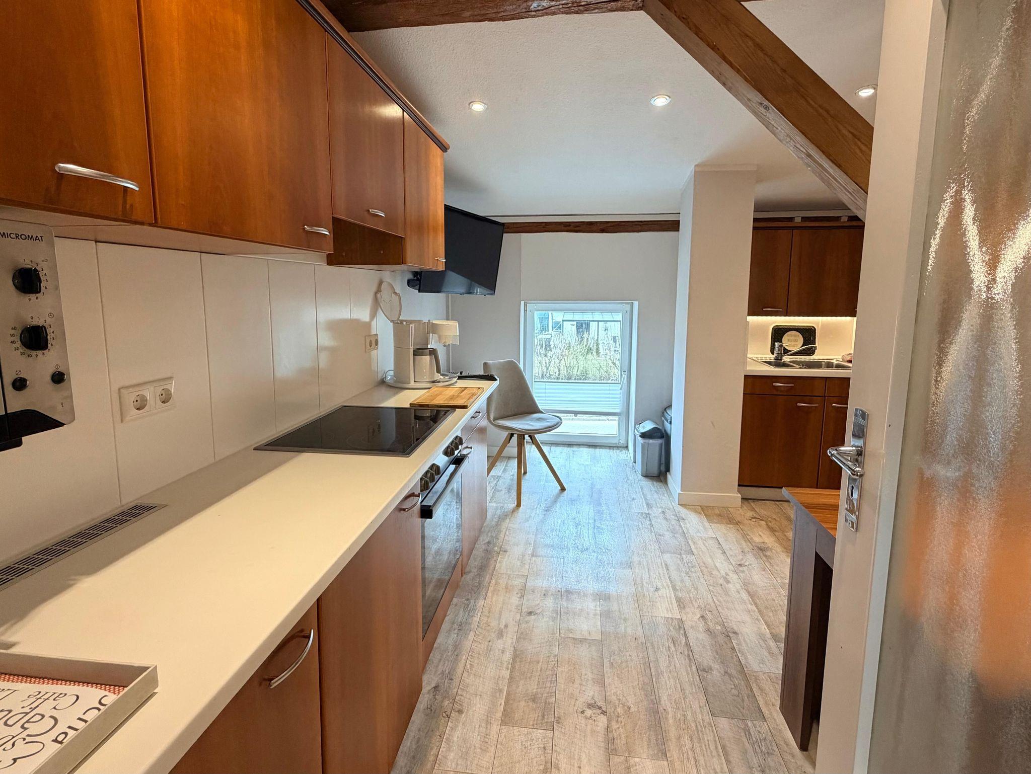 Die großzügige Wohnküche lädt zu geselligen Stunden ein. Ausgestattet mit Herd mit Ceranfeld, Backofen, Mikrowelle, zwei Kühlschränken, Kaffeemaschine, Wasserkocher, Eierkocher und Toaster sowie Geschirr und Besteck, finden Sie hier alles für eine entspannte Selbstversorgung. Ein Flachbild-TV ergänzt den Wohnbereich.
