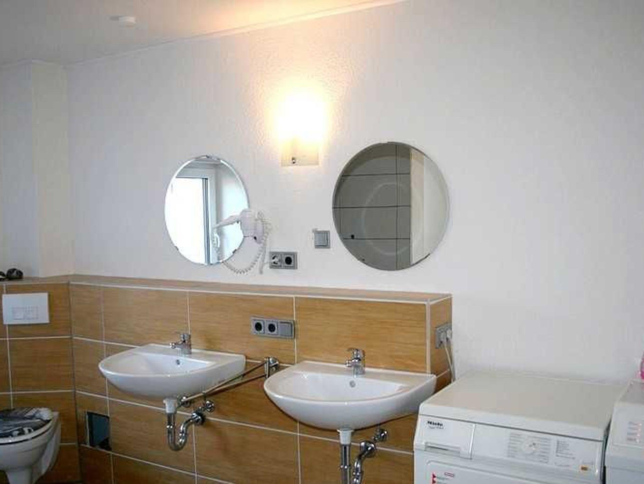 * Bad mit Dusche, Doppelwaschbecken, gefliest, Waschmaschine,