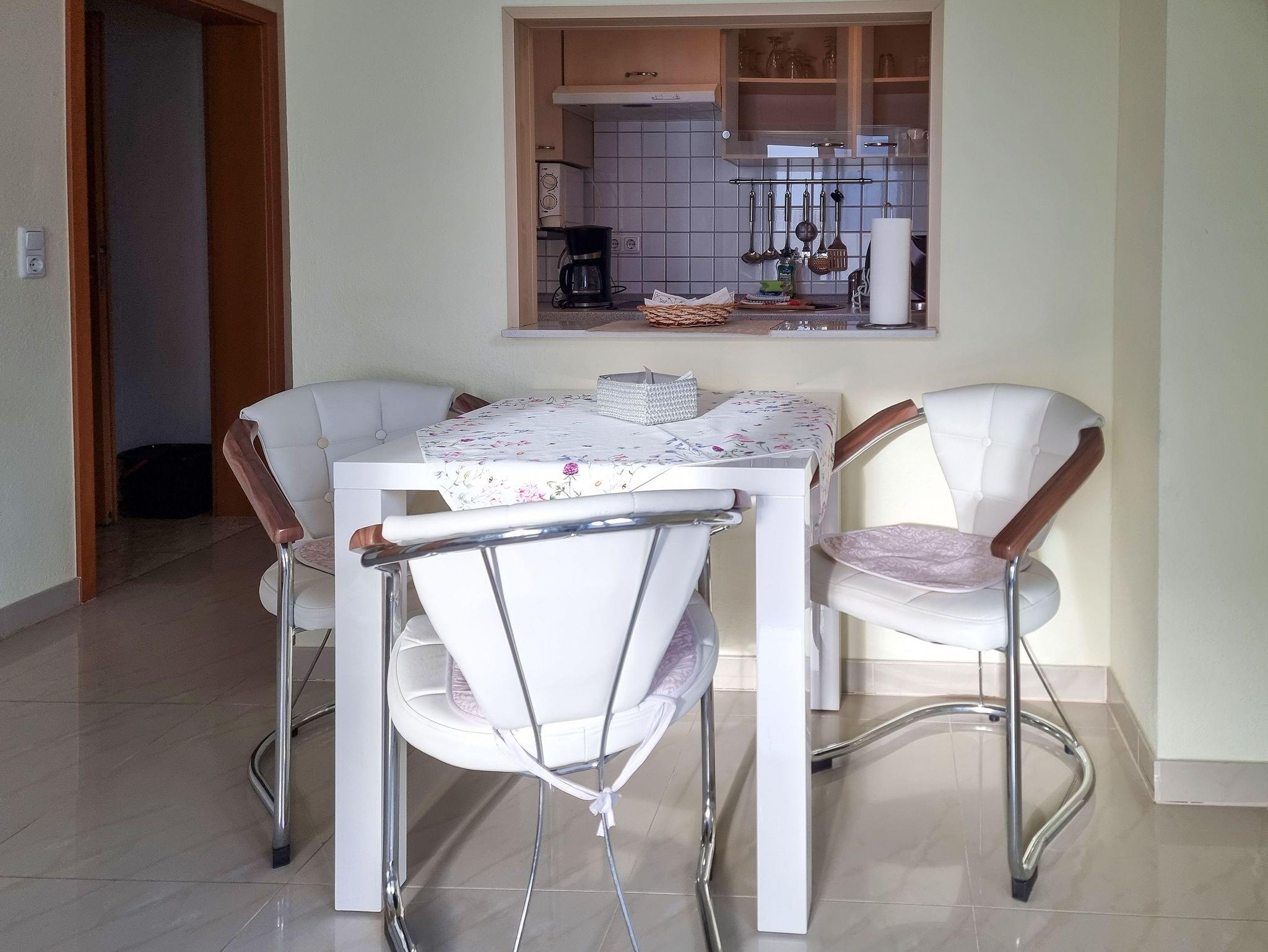 ? Der Wohnbereich bietet eine gemütlicher Couchgarnitur, Flachbidfernseher, kostenfreies WLAN und einen Esstisch für 2 Personen.