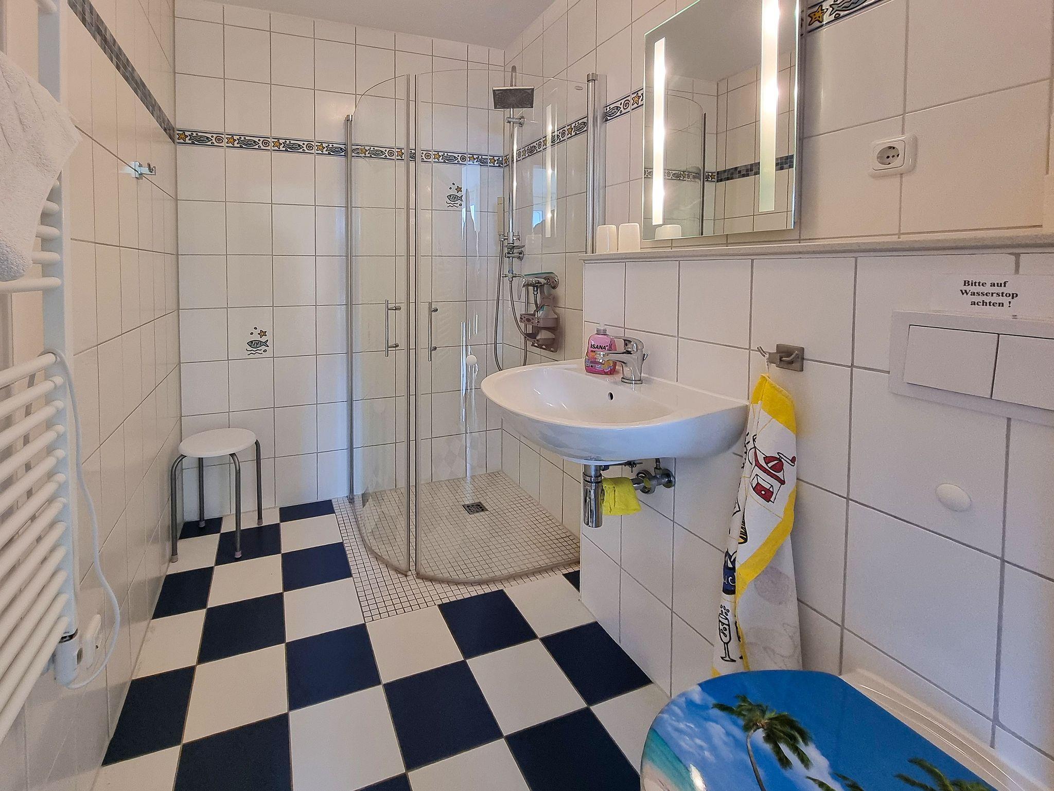 ? Das Bad verfügt über eine ebenerdige Dusche, Waschtisch und WC.