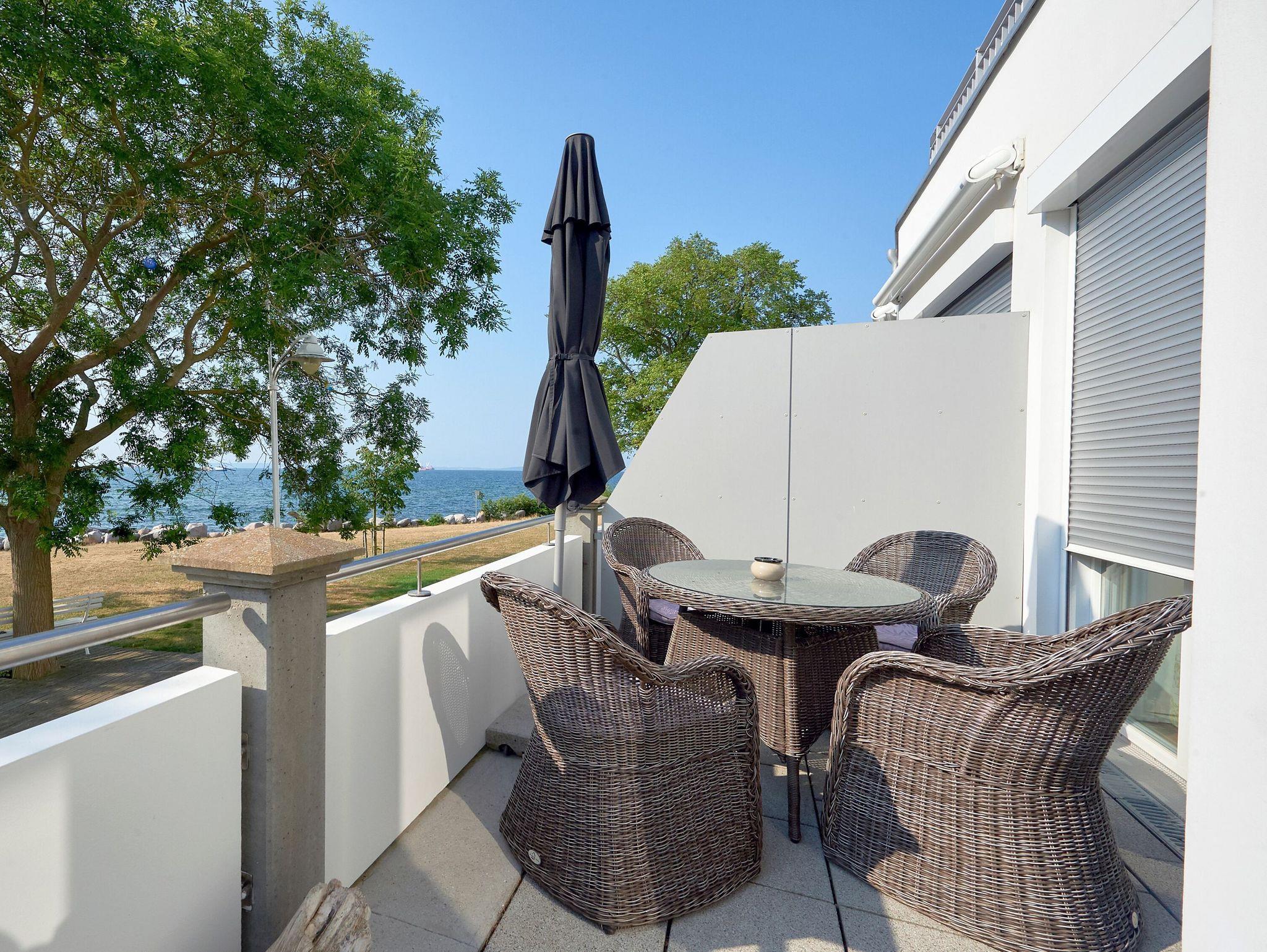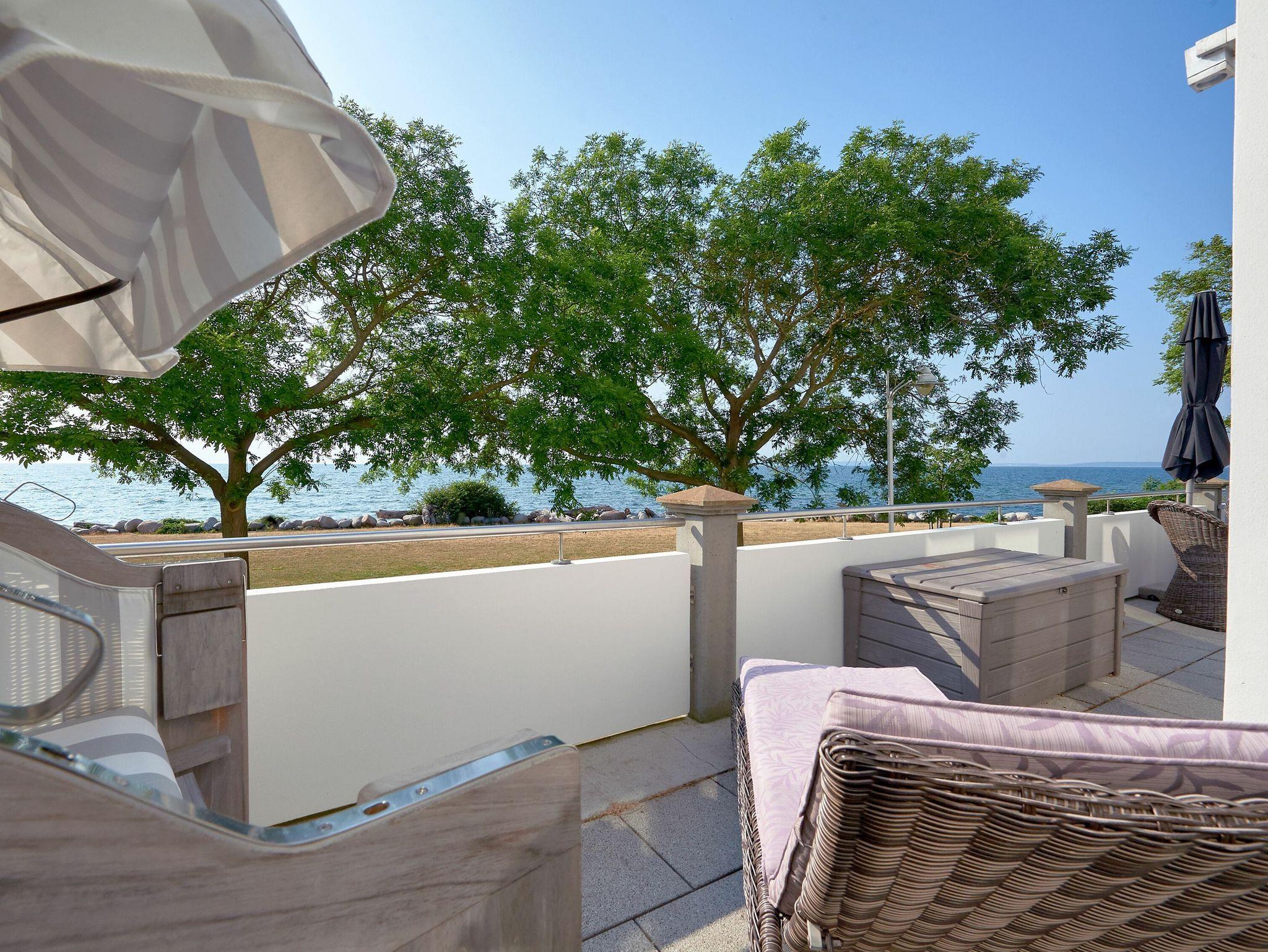? Terrasse, nach Süden ausgerichtet mit Strandkorb und grandiosen Sonnenaufgängen, Meerblick und Meeresrauschen Die Balkon- bzw. Terrassenmöbel stehen saisonal - in der Regel von Mai bis Ende September - zur Verfügung.
