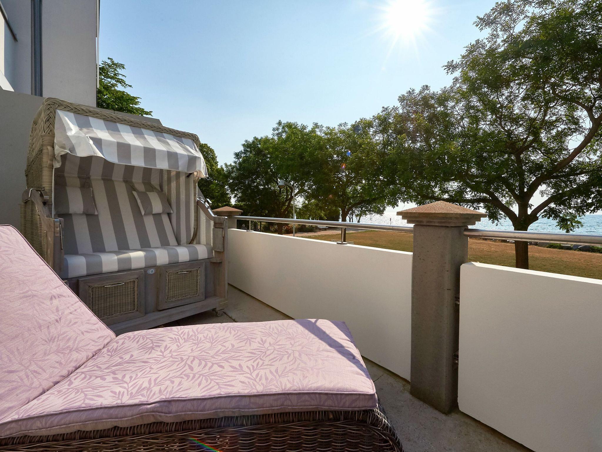 Terrasse, nach Süden ausgerichtet mit Strandkorb und grandiosen Sonnenaufgängen, Meerblick und Meeresrauschen Die Balkon- bzw. Terrassenmöbel stehen saisonal - in der Regel von Mai bis Ende September - zur Verfügung.