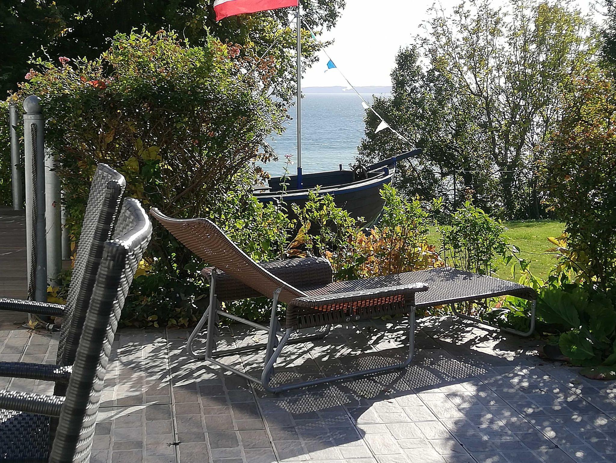 Eine kleine Terrasse mit Sitzmöbeln und einem Gasgrill ist zur Ostsee hin ausgerichtet.