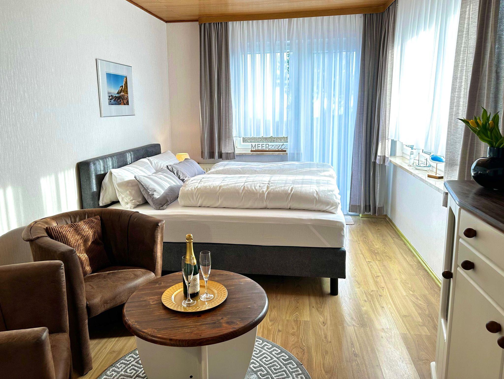 ? gemütlicher Wohn- und Schlafbereich mit Flat-TV, Sitzbereich und Doppelbett