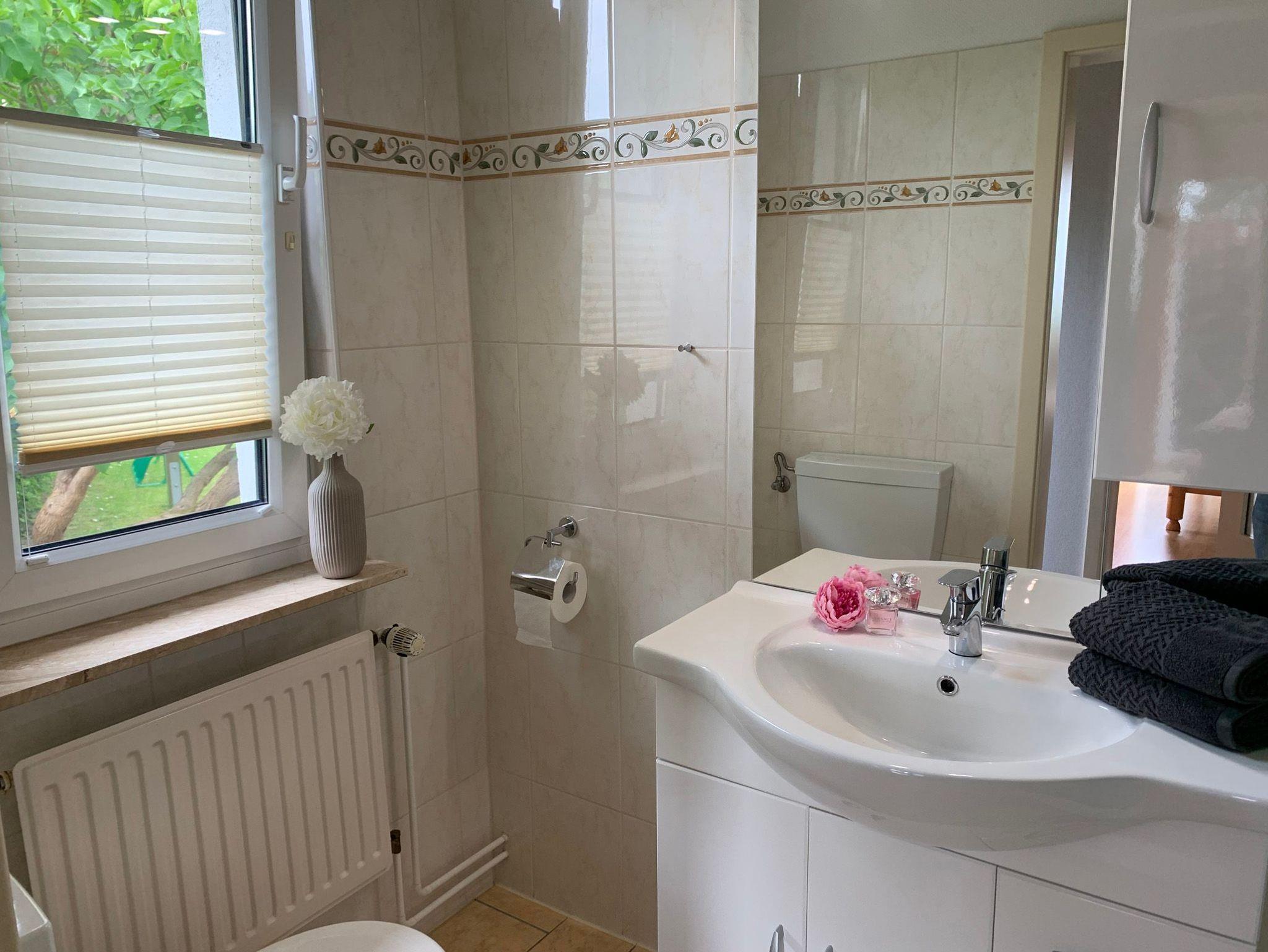 ? schönes Duschbad mit ebenerdigem Einstieg, ein Fön ist vorhanden