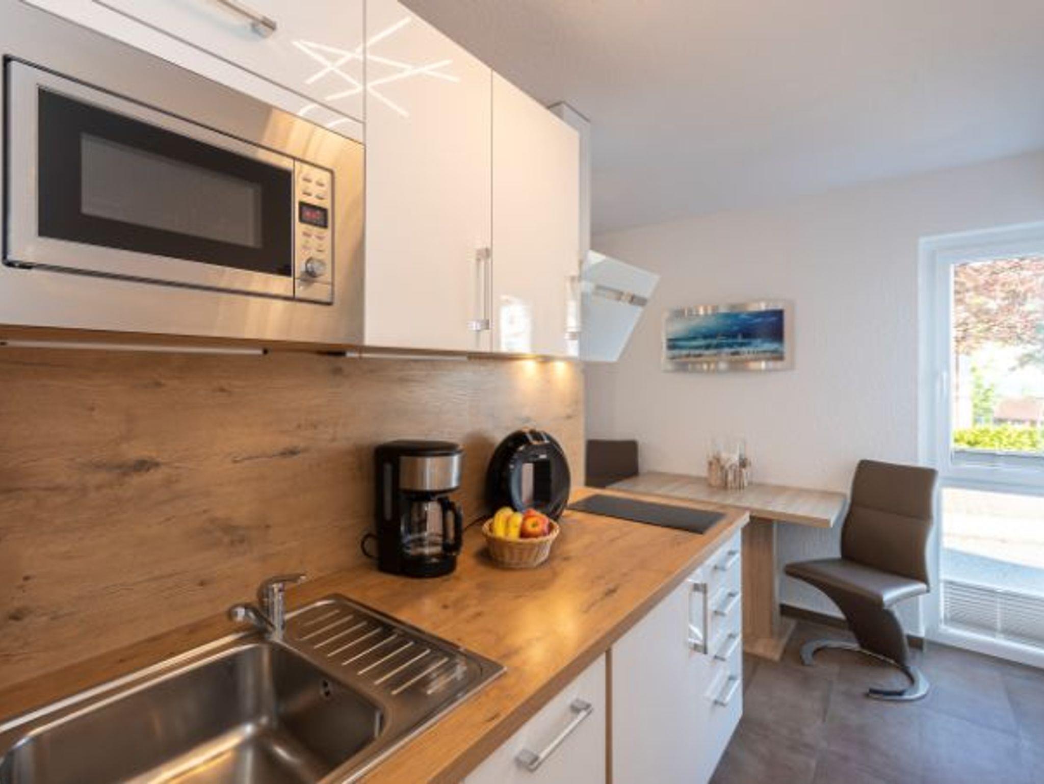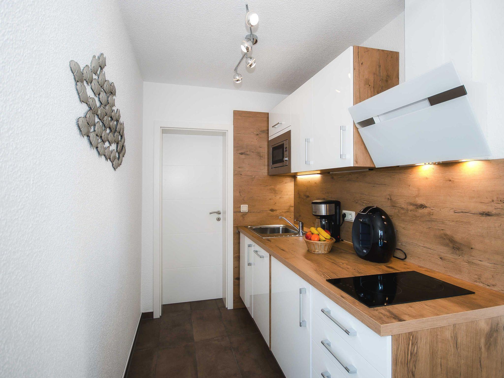 Die moderne Einbauküche hat einen Geschirrspüler, eine Mikrowelle mit Grillfunktion, ein Induktionskochfeld und ein Kühlschrank mit Gefrierfach. Zur Küchenausstattung gehören eine Kaffeemaschine, eine Kaffeekapselmaschine Dolce Gusto, ein Toaster, ein Wasserkocher sowie umfangreiche weitere Küchenutensilien.
