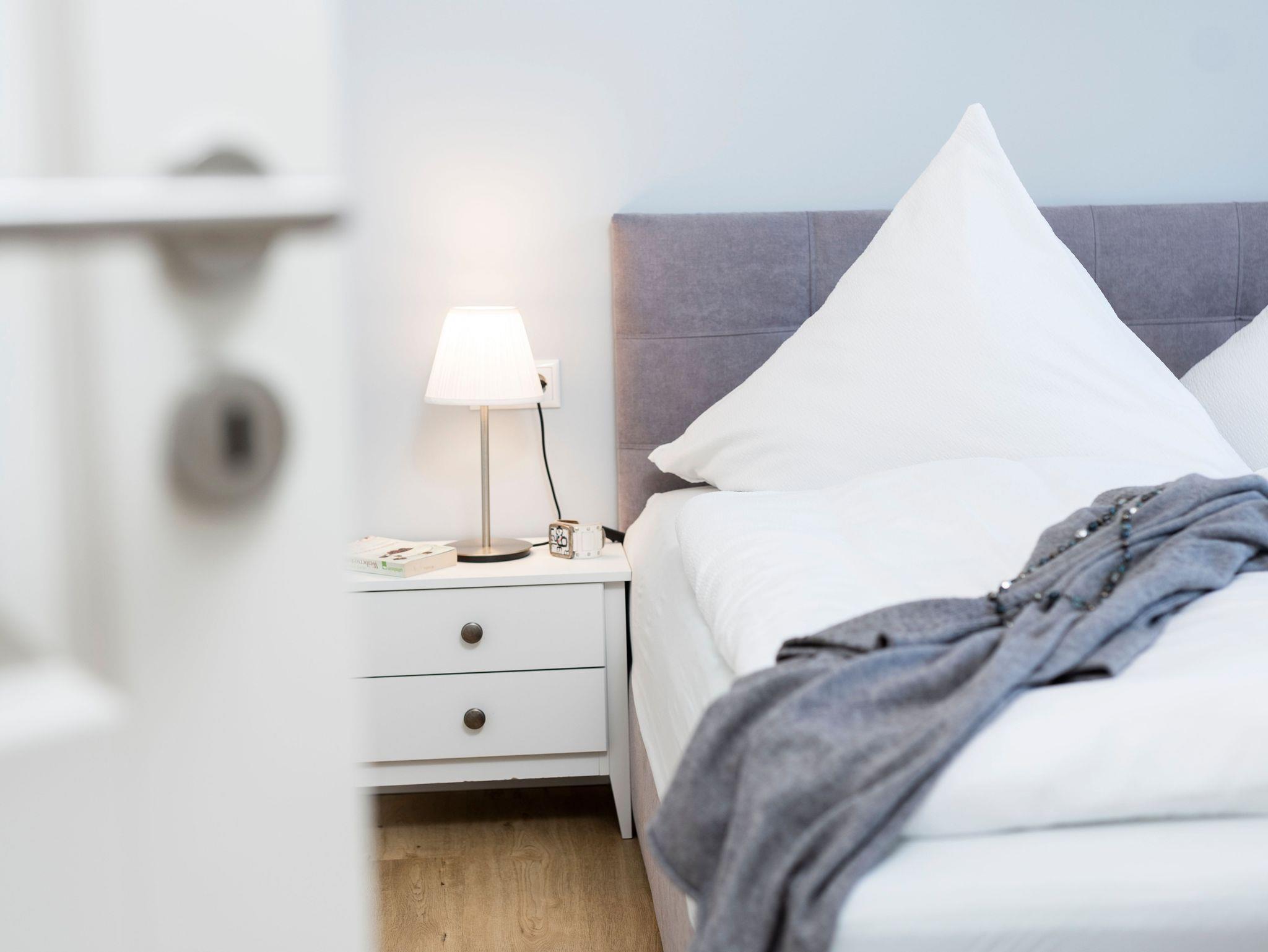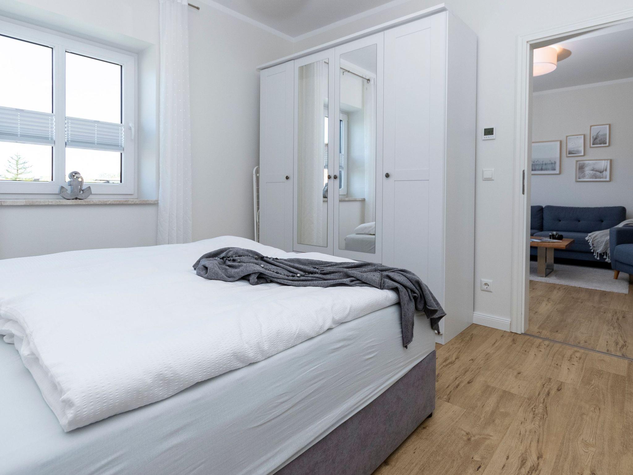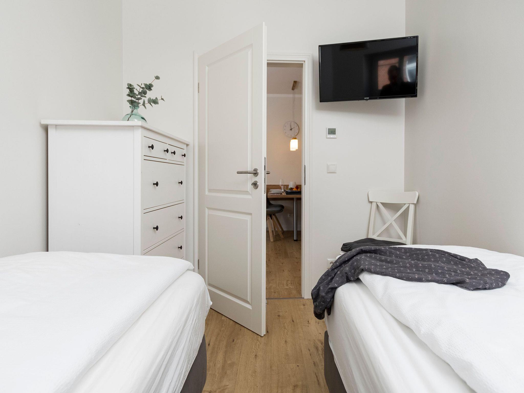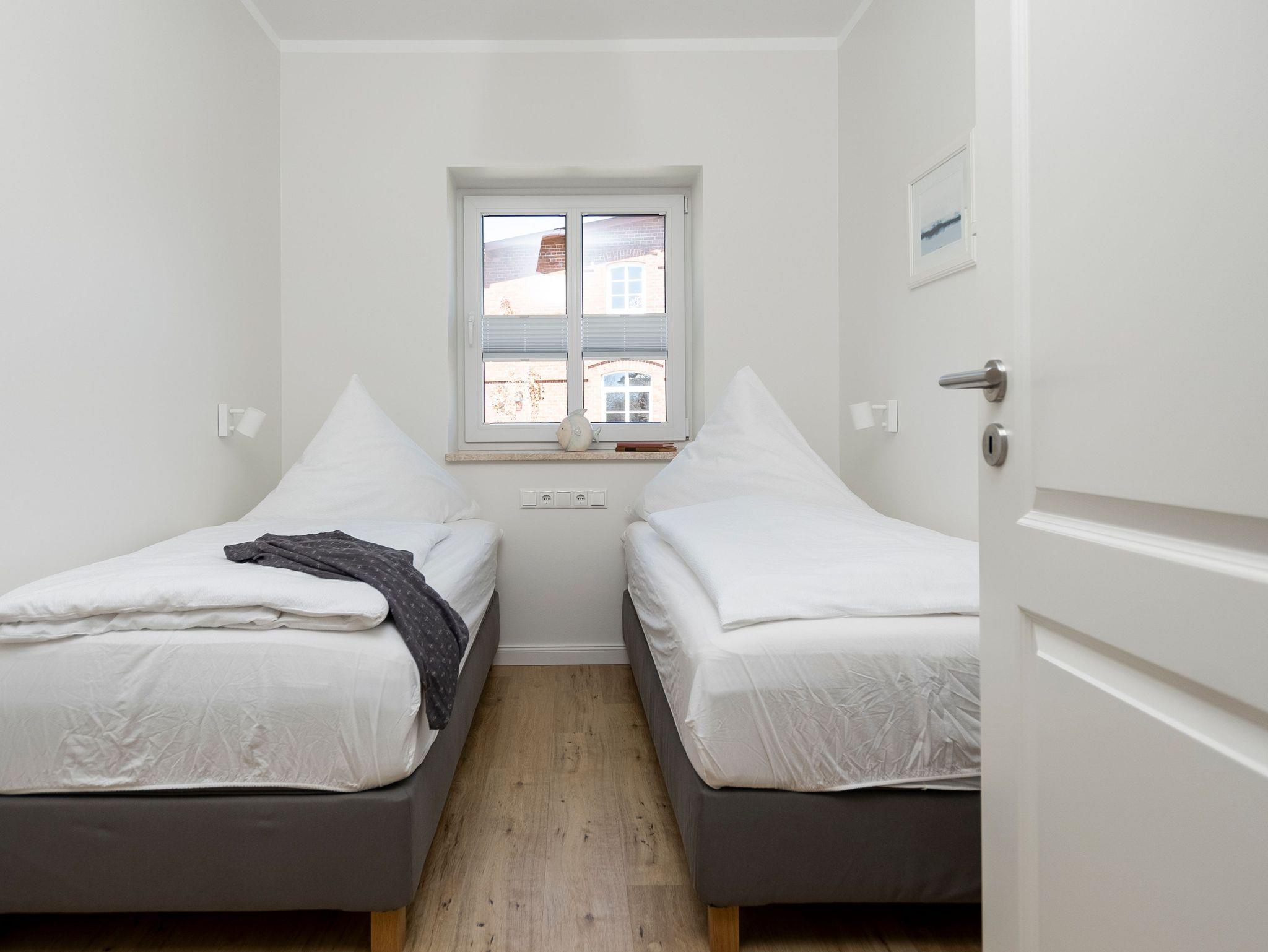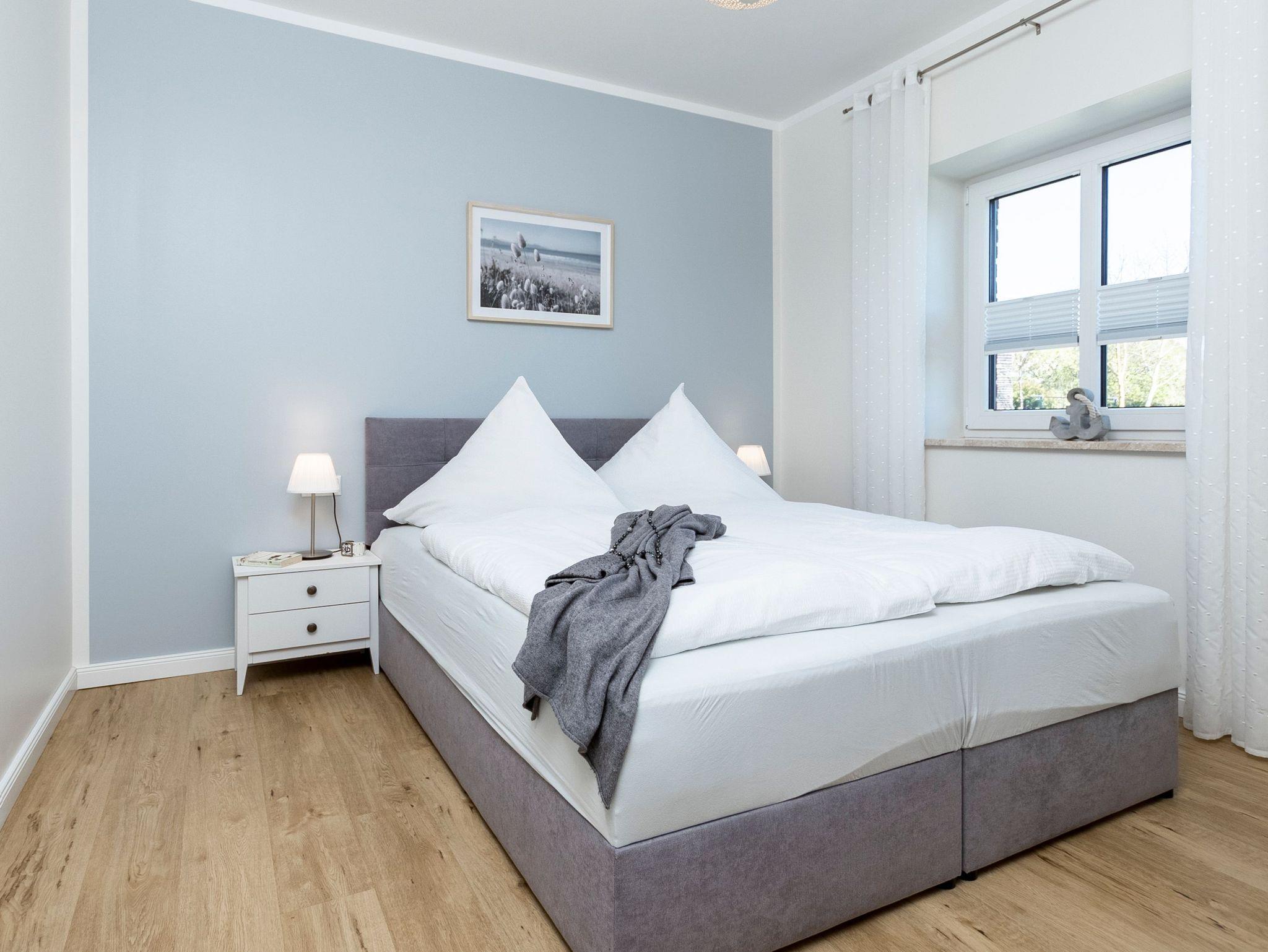 Eines der beiden Schlafzimmer bietet Ihnen ein 1,60 m breites Boxspringbett. Im zweiten Schlafzimmer stehen zwei Einzelbetten, diese können auf Wunsch aber auch gern zu einem Doppelbett zusammengefügt.