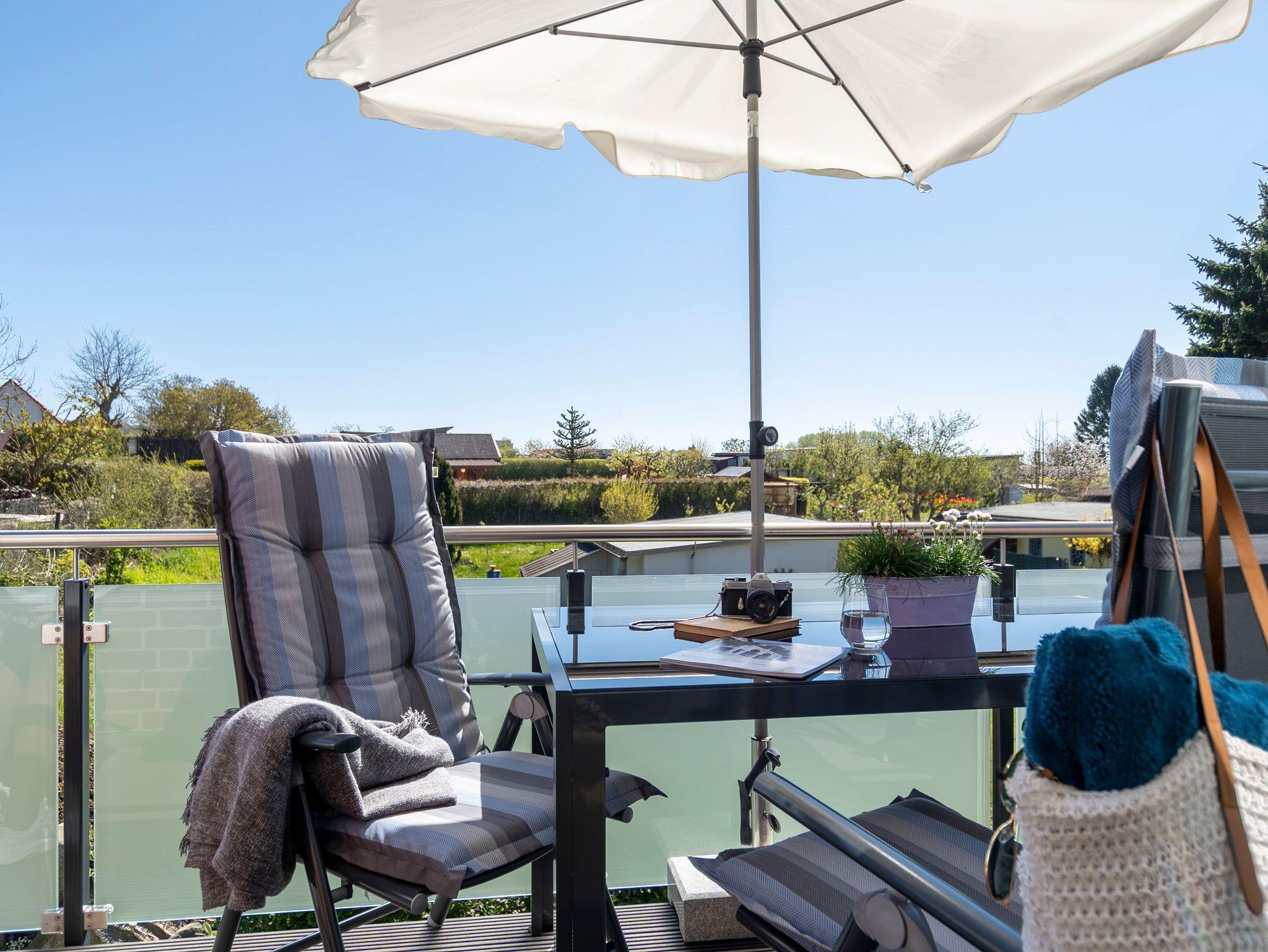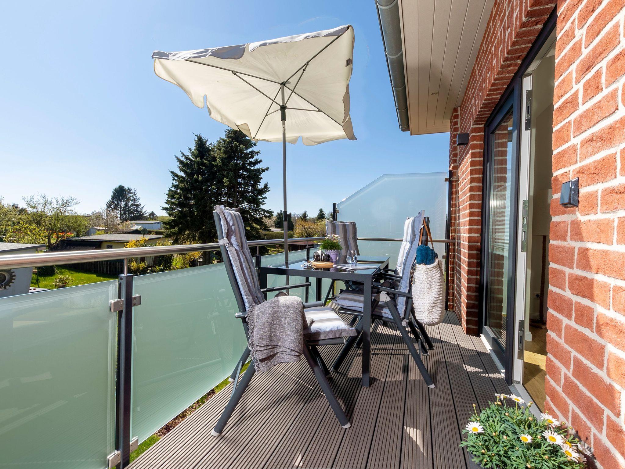 Der großzügig geschnittene Balkon ist mit einer Sitzgruppe und einem Tisch ausgestattet.