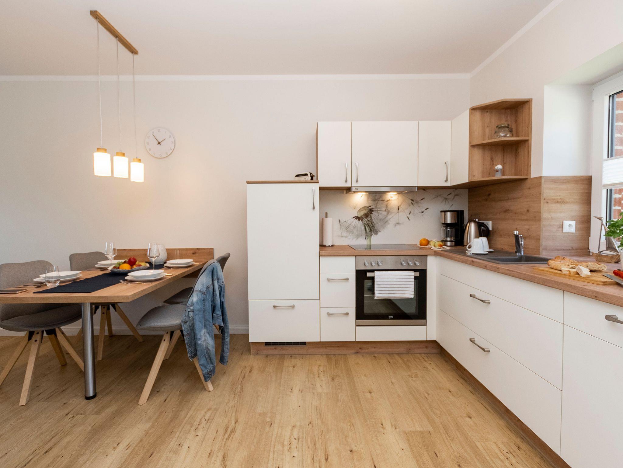 Der offen gestaltete Wohn-Kochbereich lädt zum gemütlichen Beisammensein und zu gemeinsamen Spieleabenden ein. Die Küche ist voll ausgestattet mit sämtlichen Küchengeräten, wie Geschirrspüler, Kühlschrank mit Gefriermöglichkeit, einem Herd und Ofen, einer Spüle, einem Wasserkocher und Toaster.