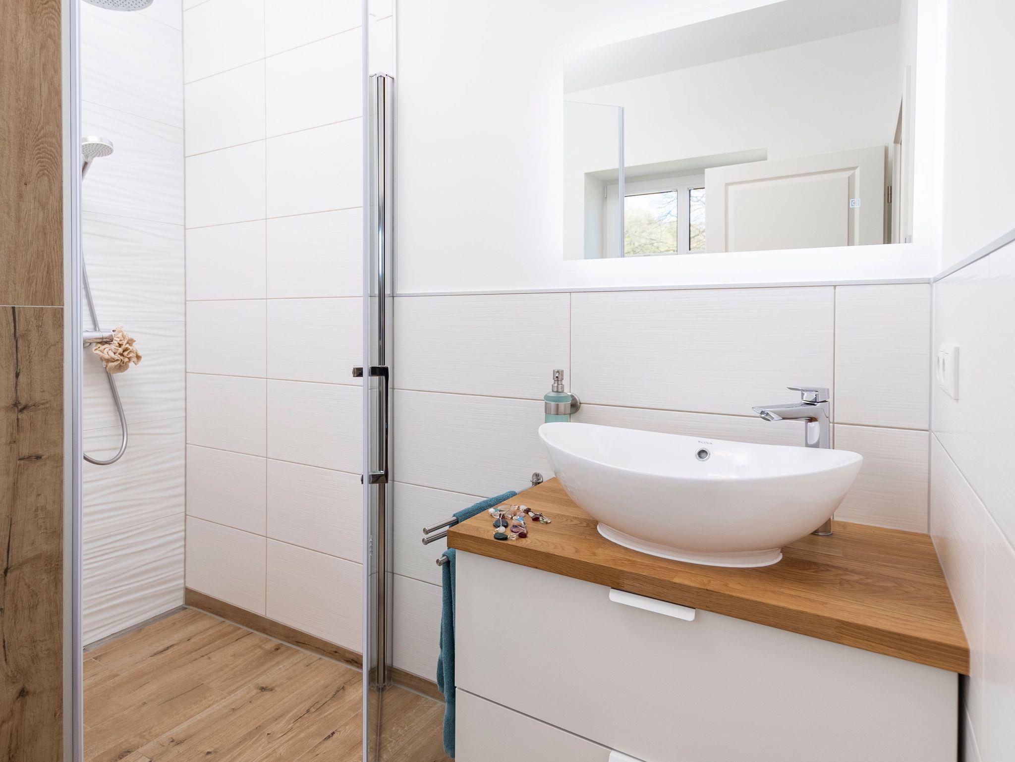 Das Tageslichtbad ist mit einer ebenerdigen Dusche ausgestattet.
