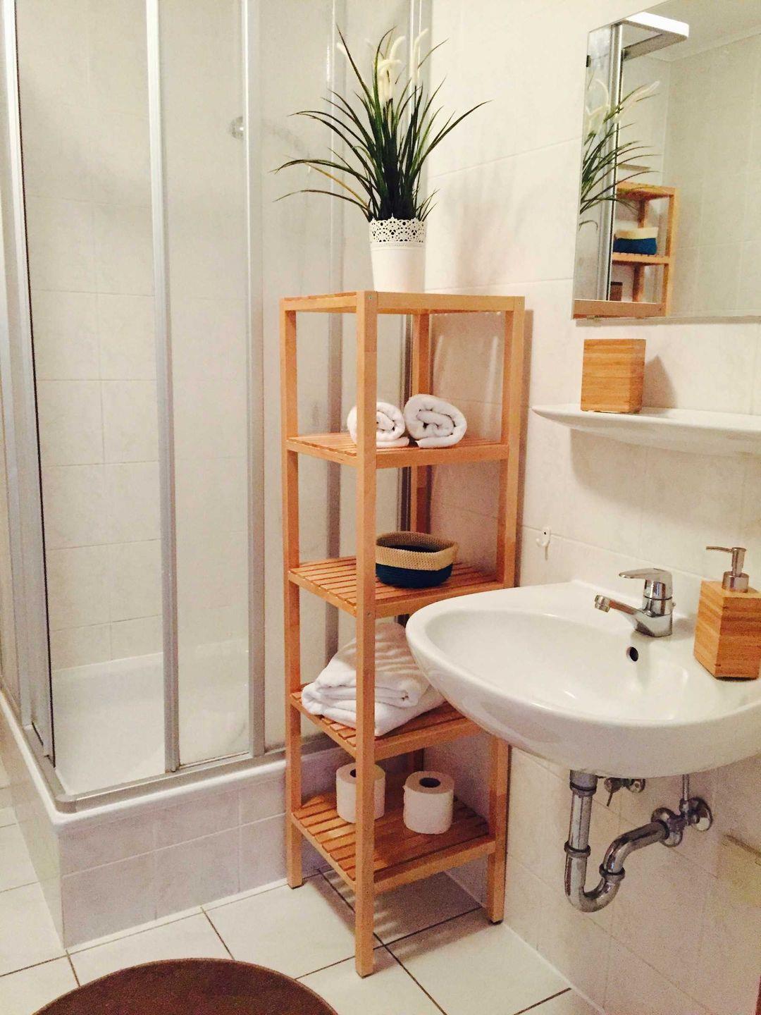 Das moderne Bad mit Dusche und WC geht vom Flur ab.