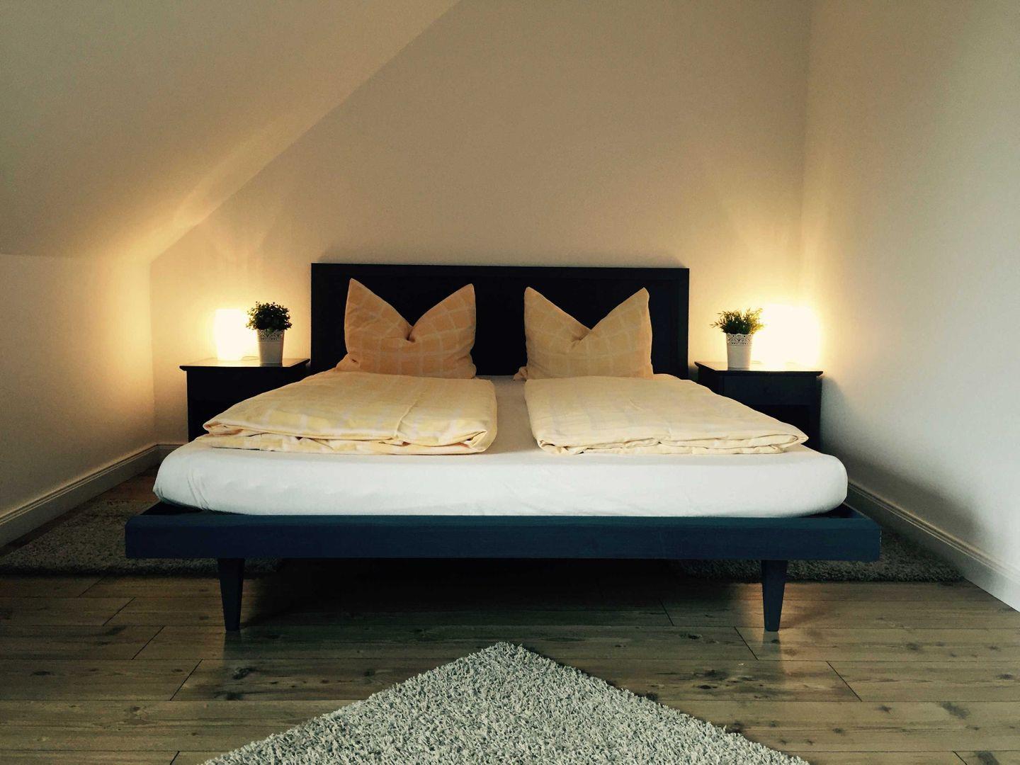 Die 2016 umfangreich renovierte Ferienwohnung befindet sich im 1.OG und hat eine Grundfläche von ca. 60 m². Das Wohnzimmer ist mit einem Tagesbett als Aufbettungsmöglichkeit für die dritte und vierte Person ausgestattet. Ein Flachbild - TV steht Ihnen für beschauliche Fernsehabende zur Verfügung. Zusätzlich finden Sie hier natürlich einen großen Esstisch und Kleinmöbel zur Aufbewahrung vor. Die liebevoll ausgewählten und aufeinander abgestimmten Wohnaccessoires lassen ein harmonisches Wohngefühl aufkommen.