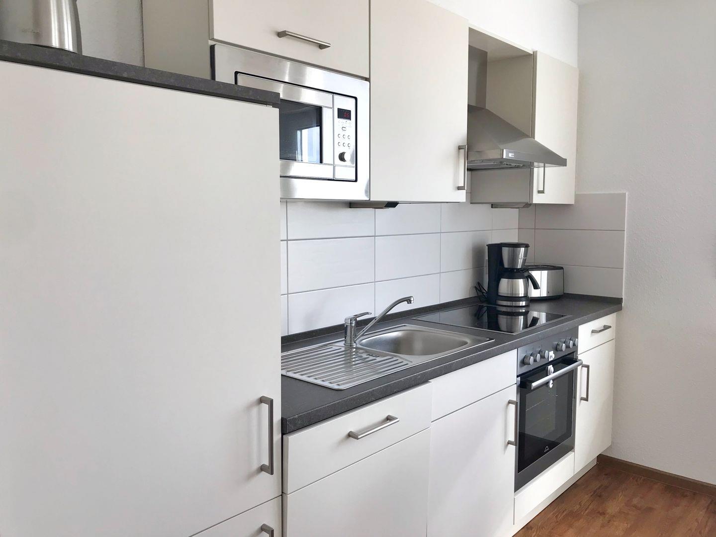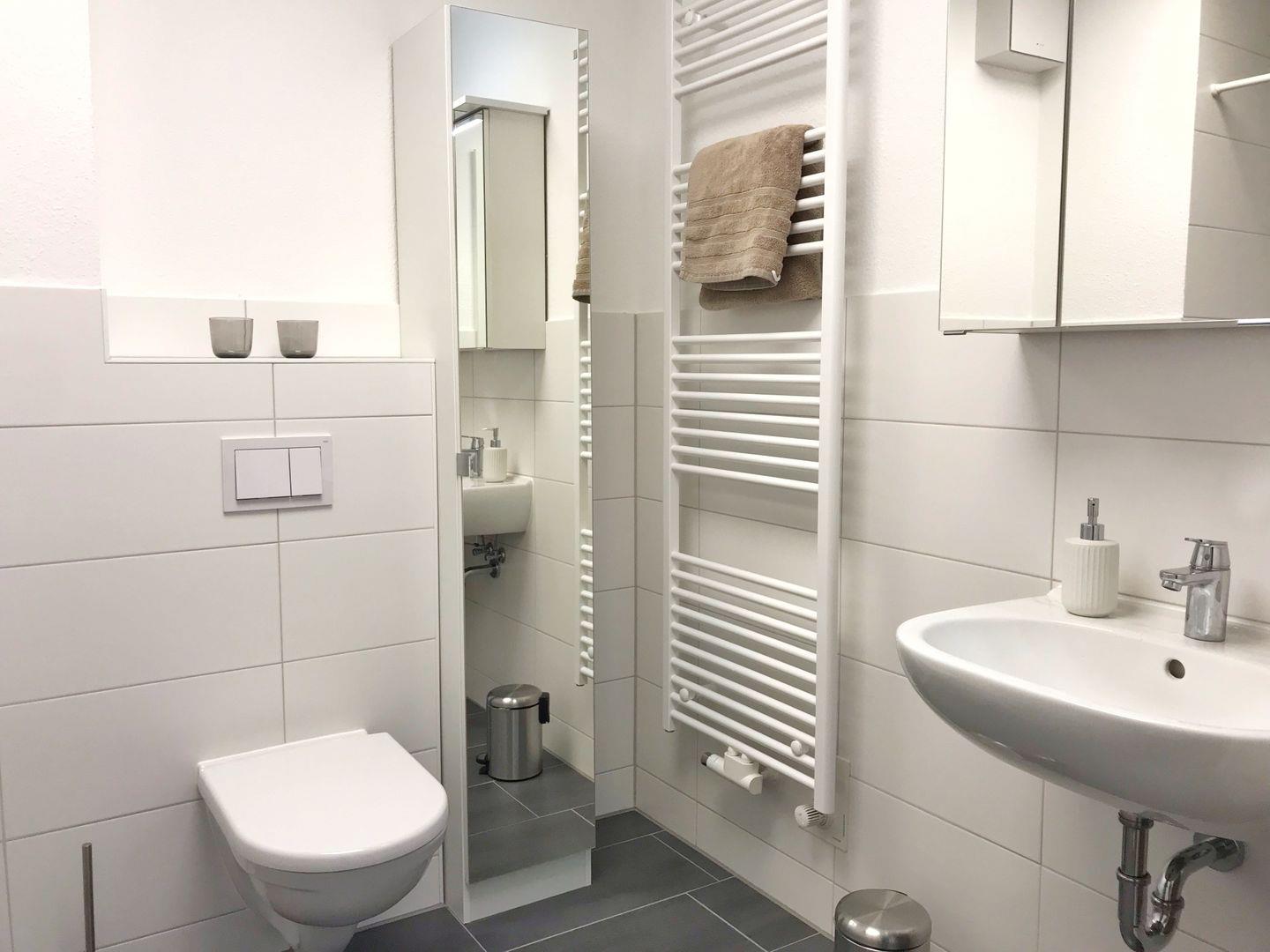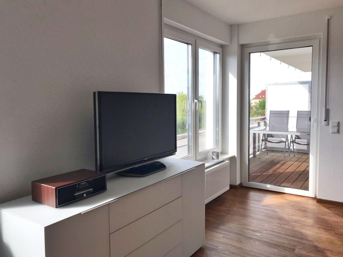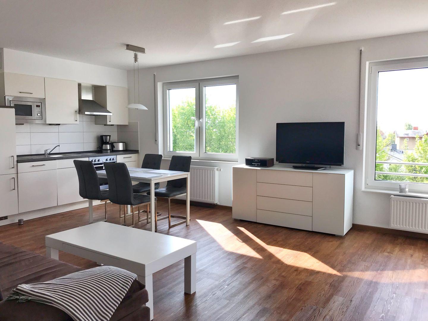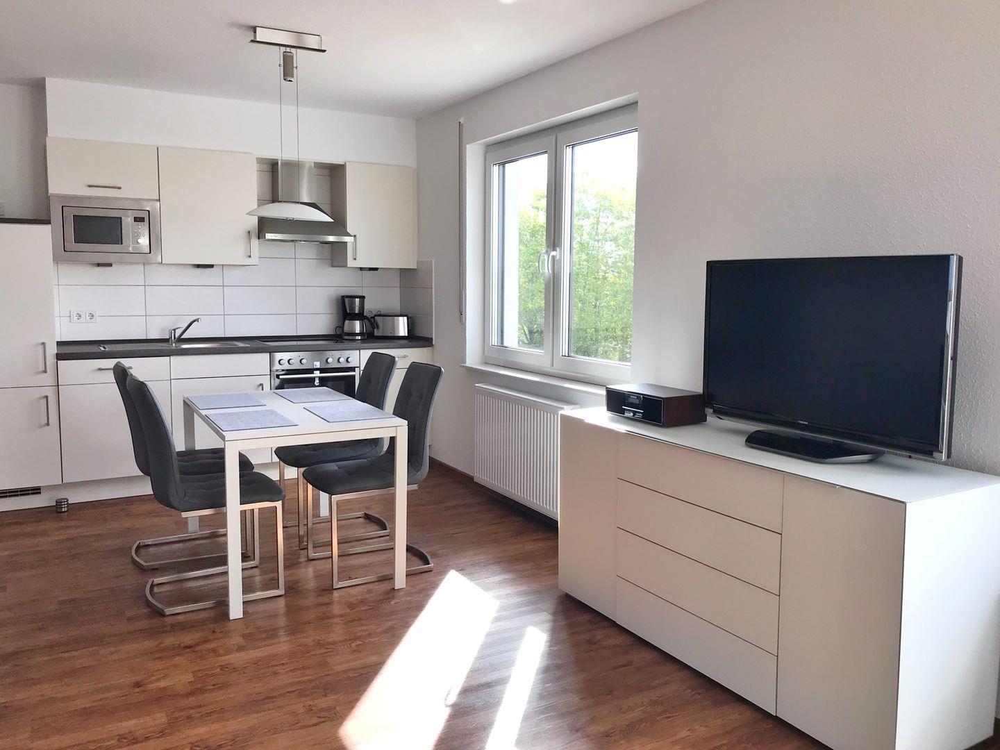 Die Ferienwohnung "Langschläfer" befindet sich im 1. OG des Hauses und hat einen Balkon Richtung Süden. Sie ist über eine Treppe und auch mit einem Fahrstuhl erreichbar. Die großzügige 2-Zimmer-Wohnung hat eine Wohnfläche von 64qm und ist ausgestattet für maximal 4 Personen. Im Schlafzimmer gibt es ein Doppelbett. Im Wohnzimmer können auf einer Schlafcouch zwei weitere Personen nächtigen. Im kombinierten Wohn-Esszimmer ist eine moderne Einbauküche integriert. Die Küche ist komplett ausgestattet mit Geschirrspüler, Ceran-Herd, Backofen, Mikrowelle, Kühlschrank mit Gefriermöglichkeit und weiteren Selbstverständlichkeiten wie Kaffeemaschine, Wasserkocher und Toaster. Im Wohnbereich gibt es einen Flachbild-TV, Radio und DVD-Player. WLAN ist in der Wohnung vorhanden. Im Bad gibt es eine ebenerdige Dusche. Die Wohnung ist hell und freundlich. Sie ist mit hellen Möbeln eingerichtet. Wegen der Barrierefreiheit und der Erreichbarkeit mit dem Fahrstuhl ist sie auch für bewegungseingeschränkte Menschen sehr gut geeignet. Zur Wohnung gehört ein reservierter Pkw-Stellplatz, gekennzeichnet mit der Nr. 5. Auf dem Grundstück gibt es eine überdachte, abschließbare Unterstellmöglichkeit für Fahrräder.