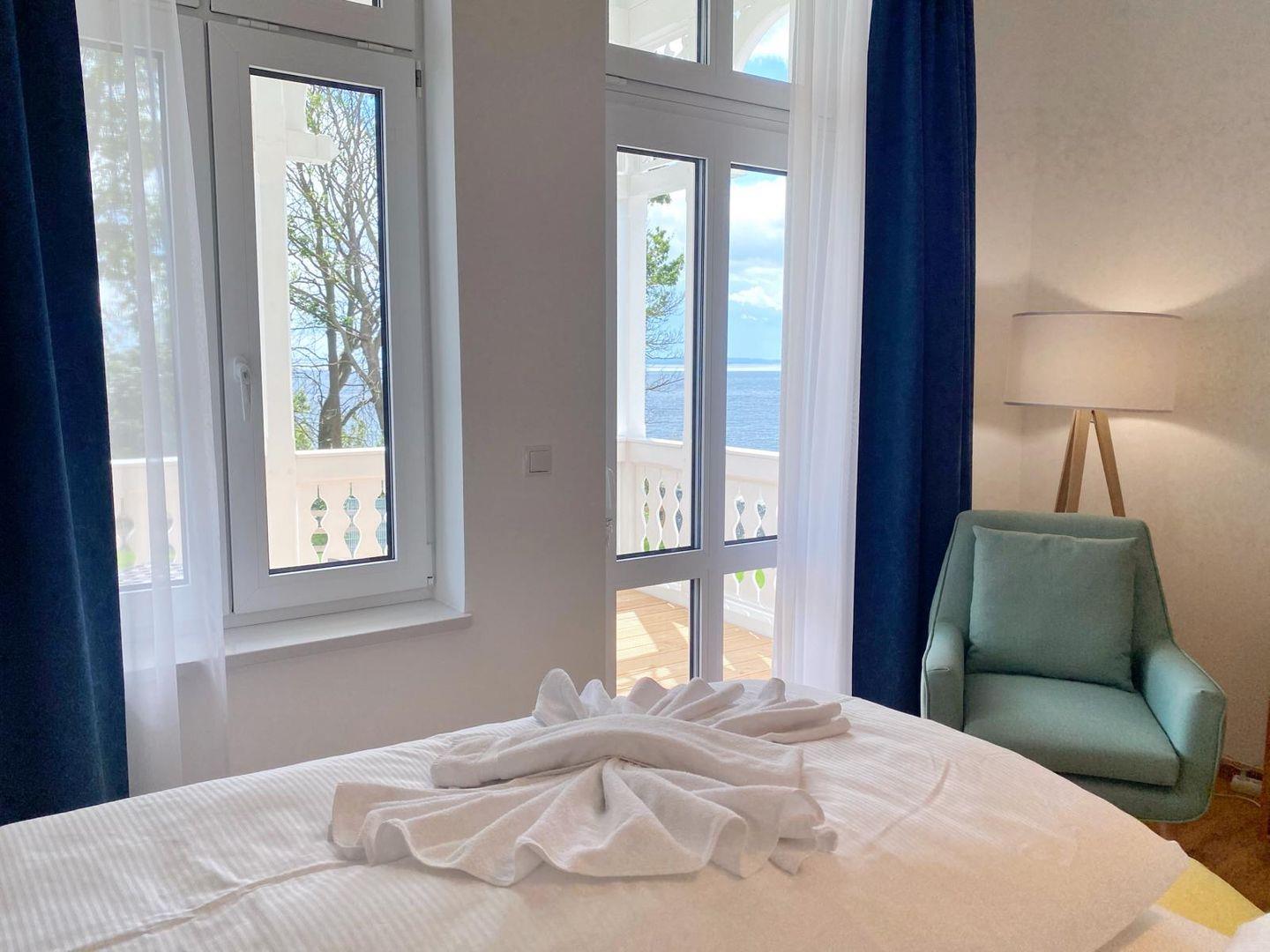 Schlafzimmer mit Doppelbett, davor ein weiterer Balkon mit Ostseeblick;