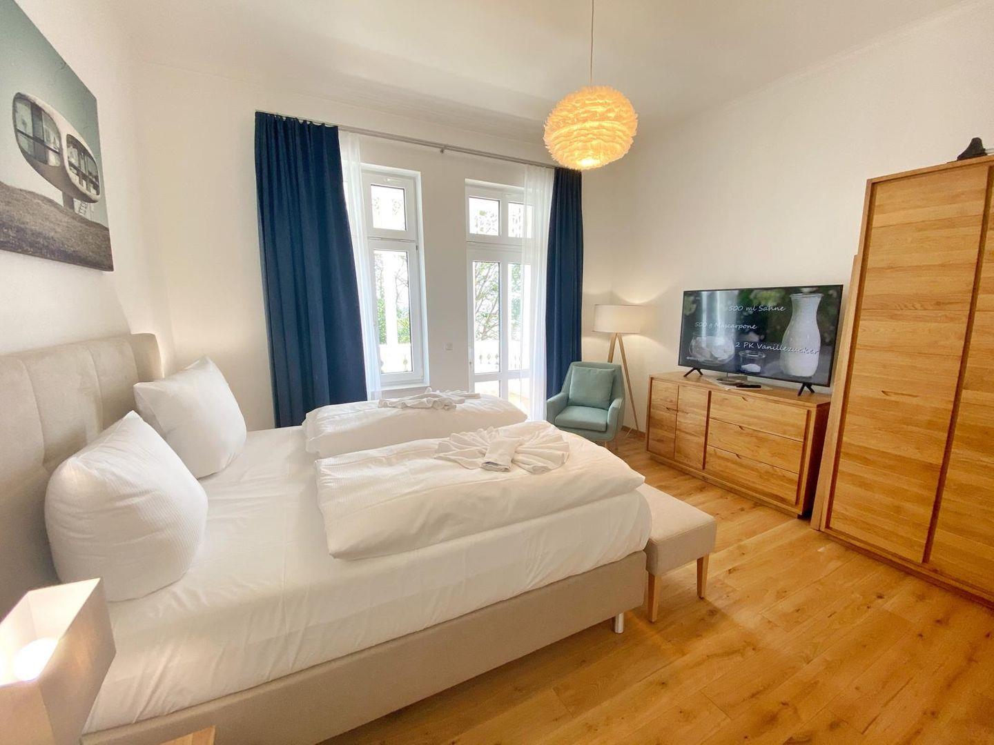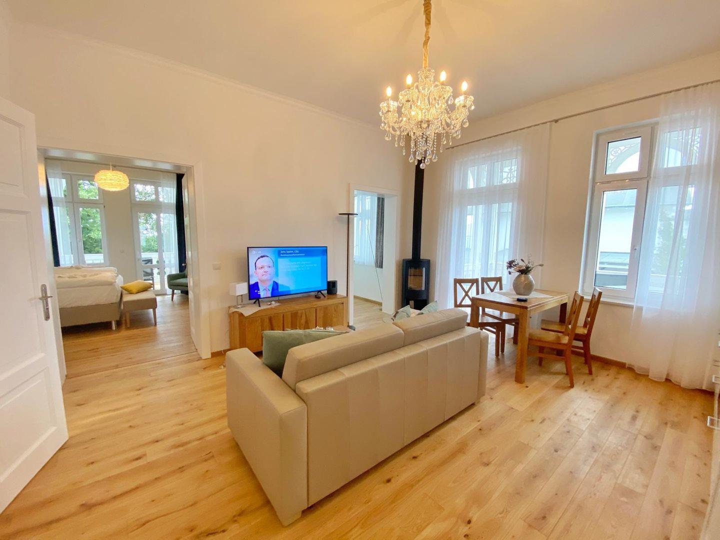 Die Villa "Jenny" ist eine hochwertig sanierte, weiße Bäder-Villa auf einem traumhaften Grundstück in erster Lage oberhalb des Steilhanges mit grandiosem Blick auf die Ostsee. Am Rande der Sassnitzer Altstadt gelegen, ist man fußläufig in nur wenigen Minuten am Alten Markt, an der Strandpromenade und am Stadthafen mit zahlreichen gastronomischen Einrichtungen und Geschäften. Die Altstadt mit den kleinen Gassen und der beeindruckenden Bäder-Architektur ist absolut sehenswert. Ebenfalls in nur wenigen Minuten ist auch der Nationalpark Jasmund erreichbar. Hier können Sie ausgedehnte Wanderungen durch den weitläufigen Buchenwald oder am Hochuferweg oberhalb der berühmten Kreidefelsen unternehmen. Die Villa "Jenny" bietet 4 hochwertige Appartements mit Balkonen und herrlichem Ostseeblick. Auf dem wunderschön angelegten und gepflegten Grundstück gibt es neben einer überdachten Grillhütte auch ein separates Saunahaus mit Ruhebereich, einen mit Holz beheizbaren Außen-Whirlpool, Sonnenliegen, Gartenmöbel und Strandkorb. Pkw-Stellplätze und Fahrradabstellmöglichkeiten sind vorhanden, ebenso ein kostenfreies WLAN. Den Gästen stehen Waschmaschine und Trockner zur Verfügung. Sie befinden sich im oberen Stockwerk - erste Tür links, neben Wohnung 4.