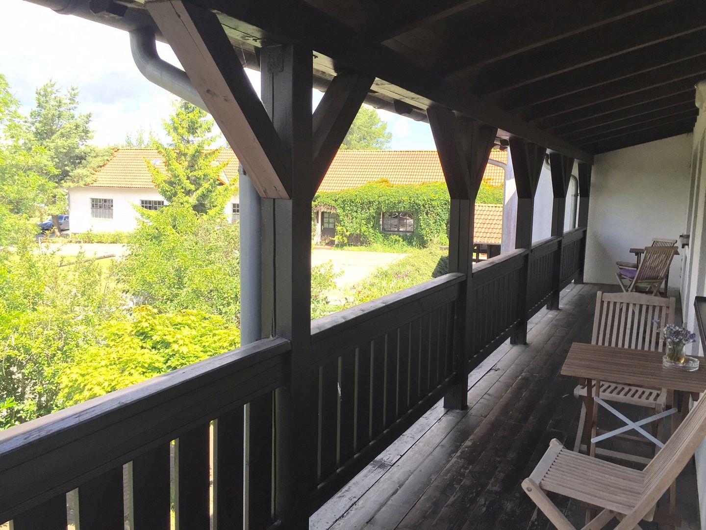 Die im Obergeschoß befindliche Nichtraucher-Ferienwohnung hat eine Grundfläche von ca. 40 m² und besteht aus einem Wohnraum mit Esstisch, Doppelbettcouch und Flachbild-TV, einem Schlafraum mit 2 Einzelbetten, einem Flur mit Miniküche (Kühlschrank, 2 Kochplatten, Kaffeemaschine, Wasserkocher, Toaster) und natürlich einem Bad mit Dusche und WC. Die gemütliche Wohnung verfügt über kostenfreies Internet sowie einen PKW-Stellplatz. Auf dem Gemeinschaftsbalkon stehen Ihnen Sitzmöglichkeiten zur Verfügung. Schauen Sie von ihr auf den schönen Innenhof und lassen Sie den Tag entspannt ausklingen!