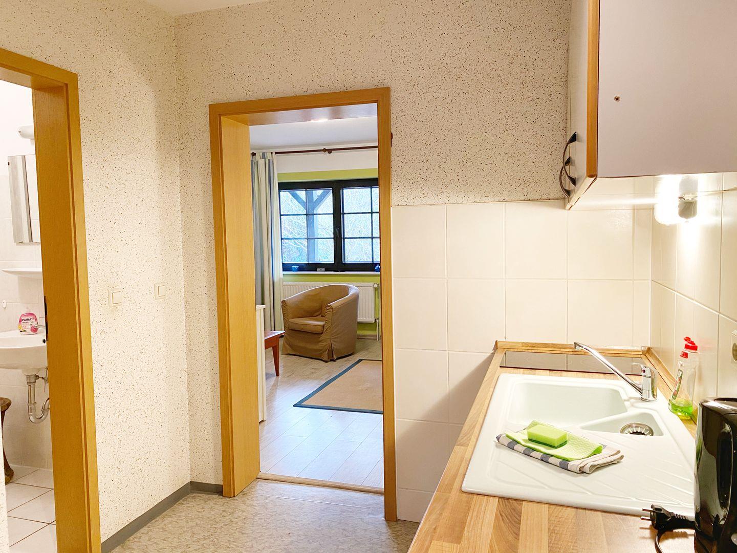 Die gemütliche Ferienwohnung hat eine Grundfläche von ca. 40 m² und verfügt über einen Wohnraum mit Doppelbettcouch und Flachbild-TV, einen Schlafraum mit Doppelbett, einen Flur mit Miniküche (Kühlschrank, 2 Kochplatten, Kaffeemaschine, Wasserkocher, Toaster) und natürlich ein Bad mit Dusche mit WC. Sie befindet sich im Erdgeschoss und hat einen direkten Zugang über die Terrassentür nach draußen. Hier können Sie den erlebnisreichen Urlaubstag ausklingen lassen.