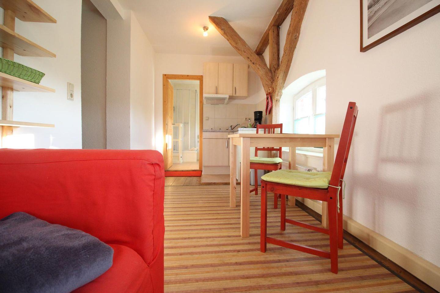 -ein kleiner Holztisch mit Stühlen befindet sich direkt vor dem Fenster, so dass Sie dort gemütlich sitzen und essen können.