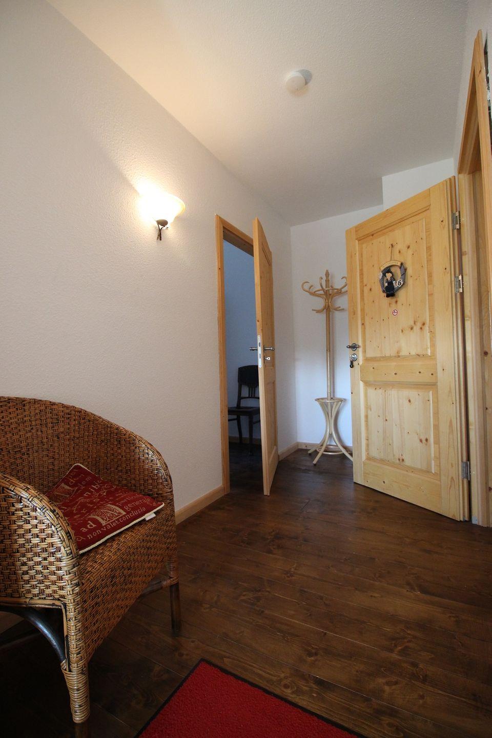 Treten Sie ein und fühlen Sie sich wohl! Wenn Sie im Flur der Wohnung stehen, können Sie einen Blick in das gemütliche Schlafzimmer mit Aussicht in den Garten werfen! Sie schauen durch das