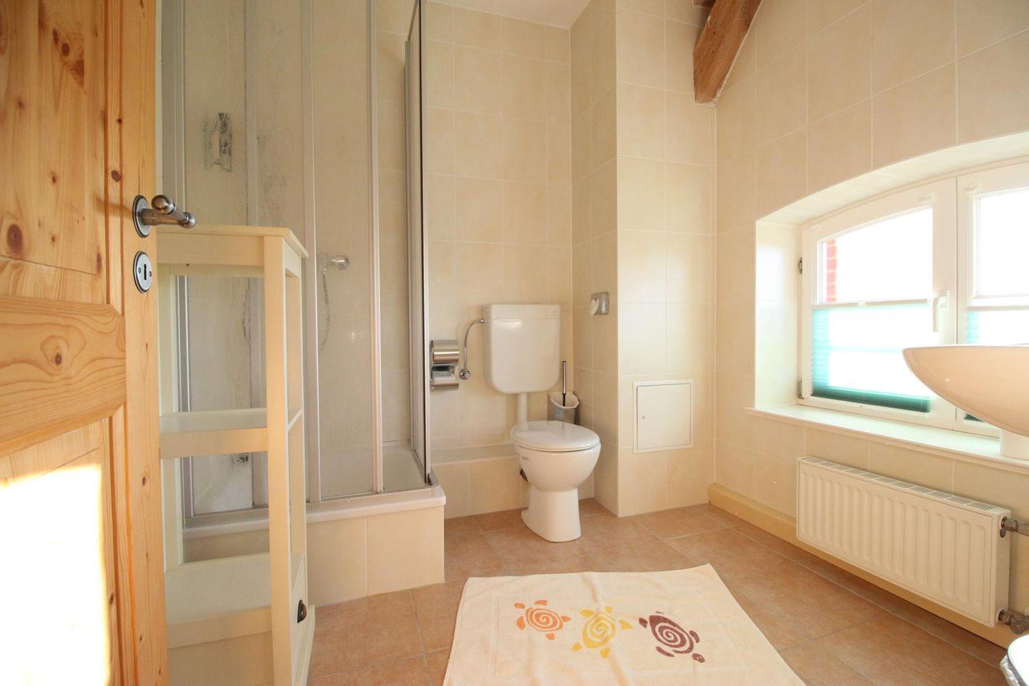 Das helle Tageslichtbad befindet sich links neben der Küchenzeile. Hier gehört zur Ausstattung: