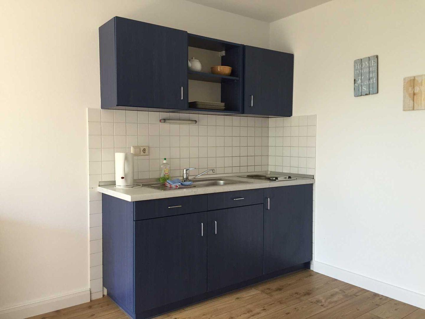Das Schlafzimmer ist gemütlich eingerichtet und besitzt ein großes Doppelbett, einen Kleiderschrank und einen kleinen Tisch mit zwei Stühlen. Aus dem Fenster können Sie von hier bis zur Ostsee zum Fährhafen Mukran schauen! Im Flur mit Miniküche (Kühlschrank, Zweiplattenherd, Kaffeemaschine, Wasserkocher, Toaster) können Sie sich Ihr Essen zubereiten. Probieren Sie unbedingt regionale Spezialitäten und Fischgerichte aus!