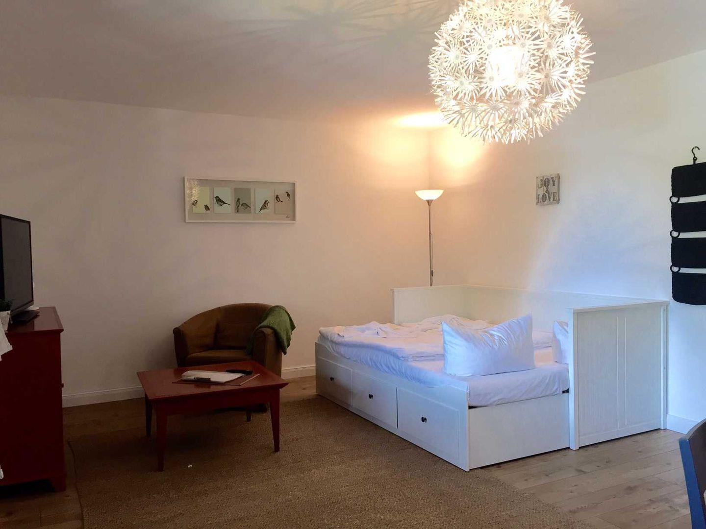 Die im Jahr 2016 neu renovierte Ferienwohnung hat eine Grundfläche von ca. 60 m² und verfügt über einen Wohnraum mit Tagesbett ( zur Aufbettung für die dritte und vierte Person). Hier können Sie gut erholt in den nächsten Tag starten. Des weiteren stehen Ihnen hier eine Sitz-/ Essecke und ein Flachbild - TV zur Verfügung.
