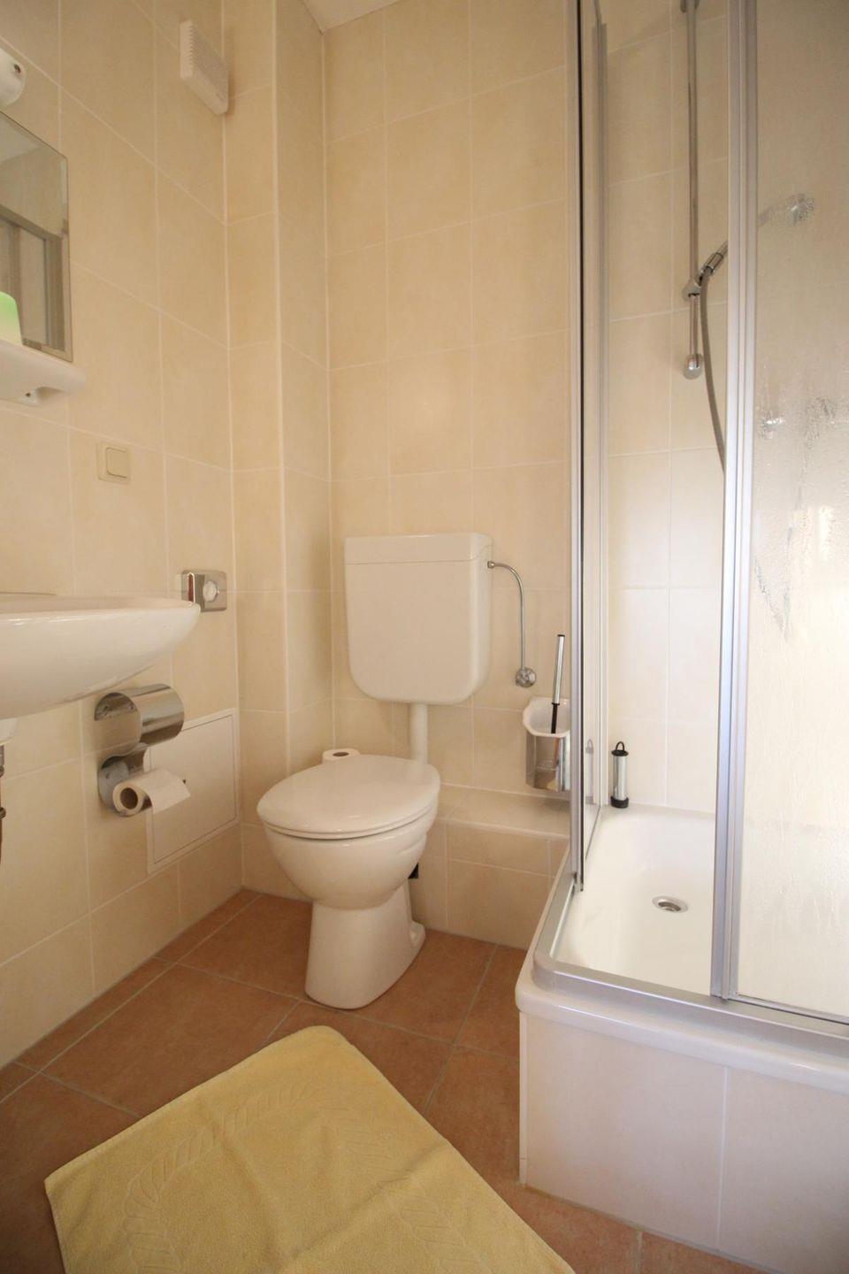 Das Badezimmer finden Sie vor dem Schlafbereich links. Hier gehört zur Ausstattung: