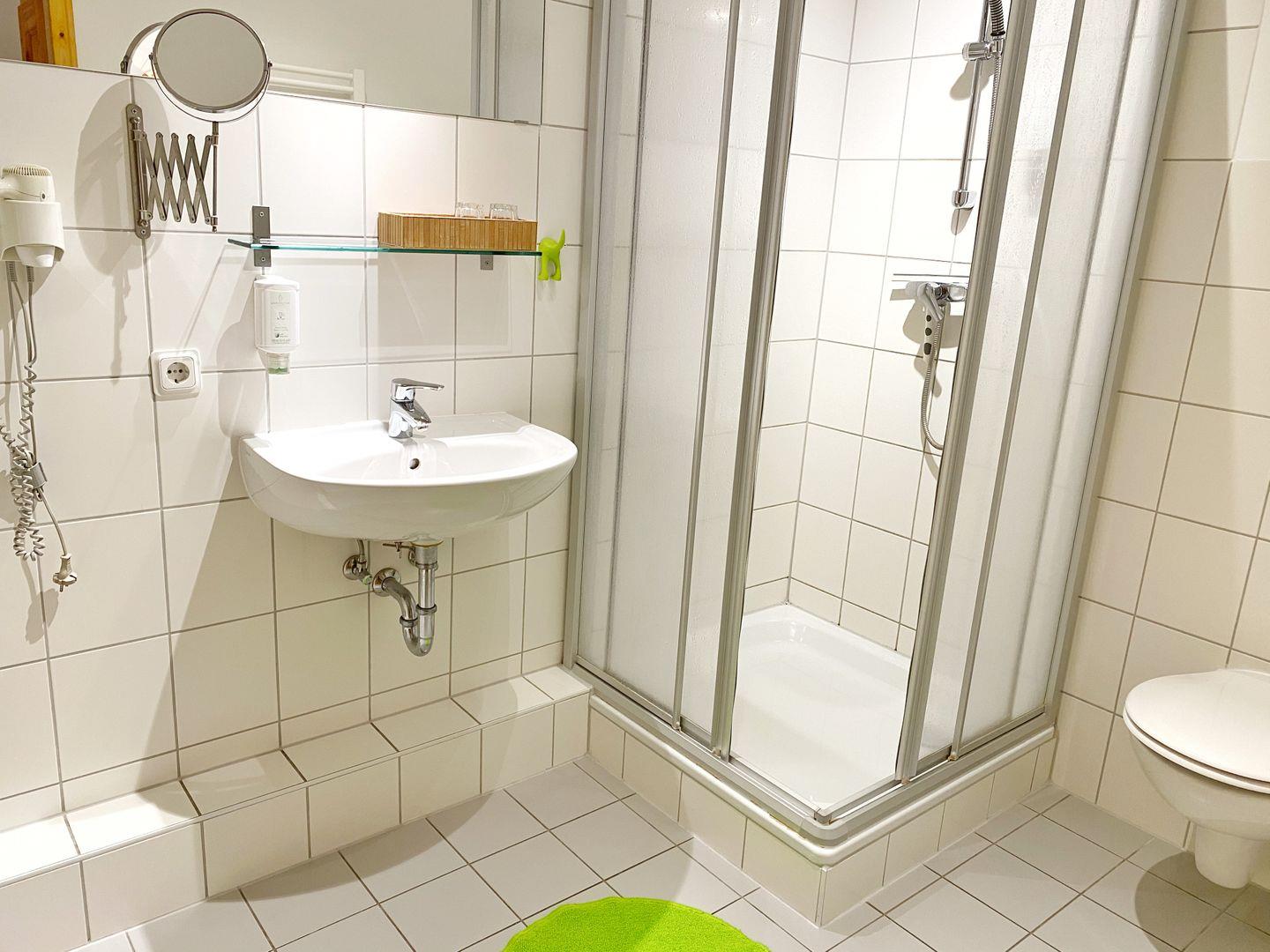 Raumaufteilung: Wohnraum, Schlafzimmer, Küche, Bad mit Dusche und Fön.