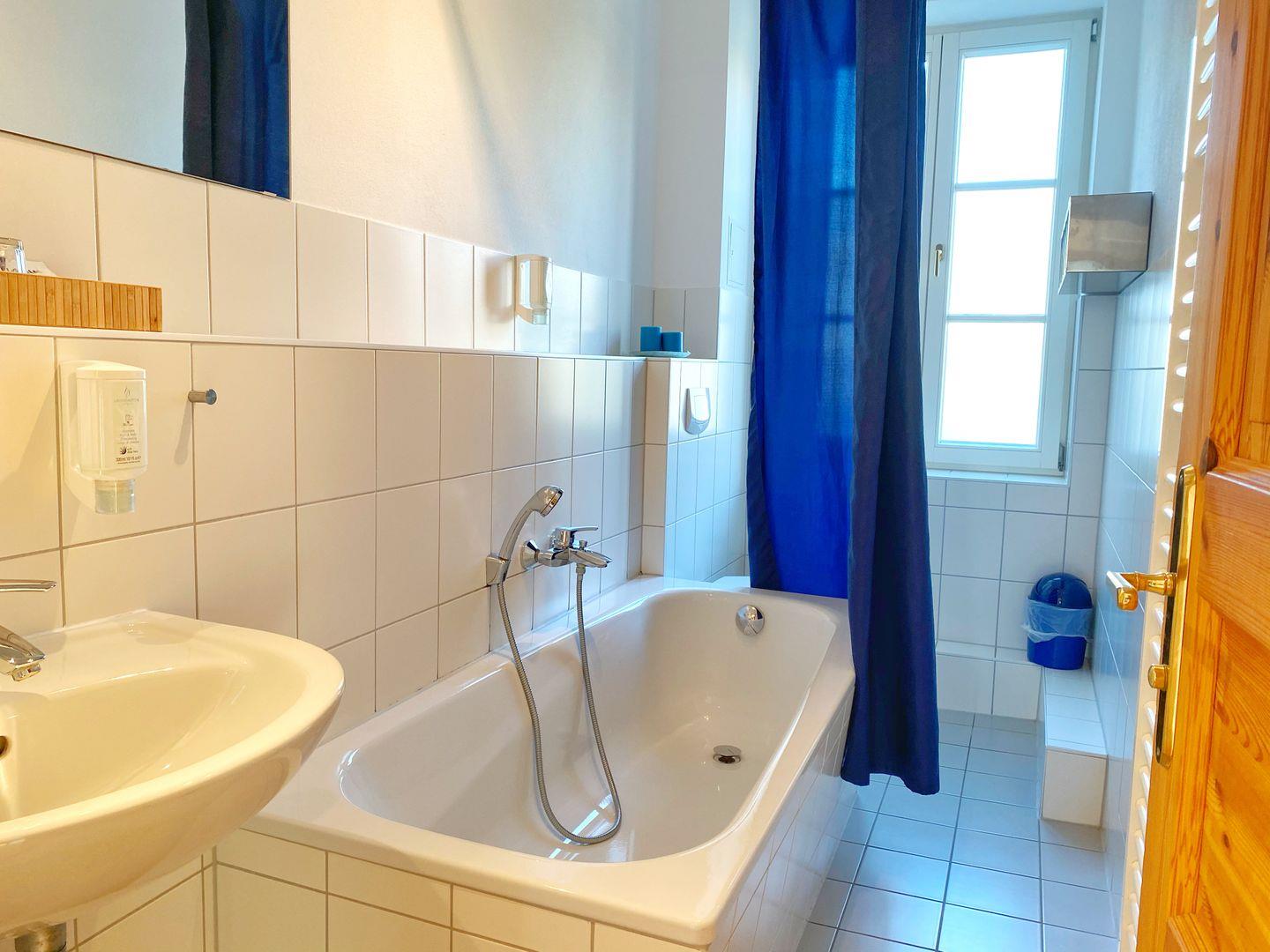 Raumaufteilung: Wohnraum, Schlafzimmer, Küche, Bad mit Badewanne und Fön.