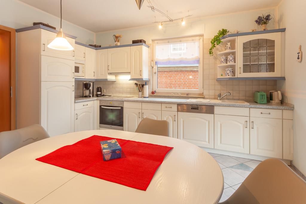 Die Küche ist separat und ebenfalls hell, freundlich und großzügig mit Esstisch und moderner Einbauküche im Landhausstil ausgestattet. Neben Geschirrspüler, Mikrowelle, Kühlschrank mit Gefriermöglichkeit, Ceranfeld und Backofen sind eine Kaffeemaschine, Wasserkocher und Toaster selbstverständlich.